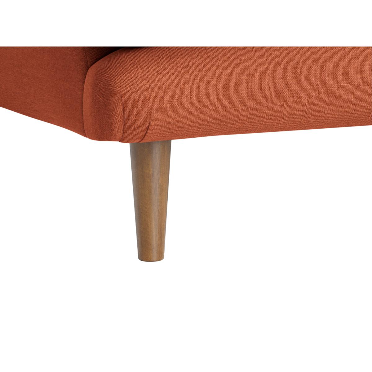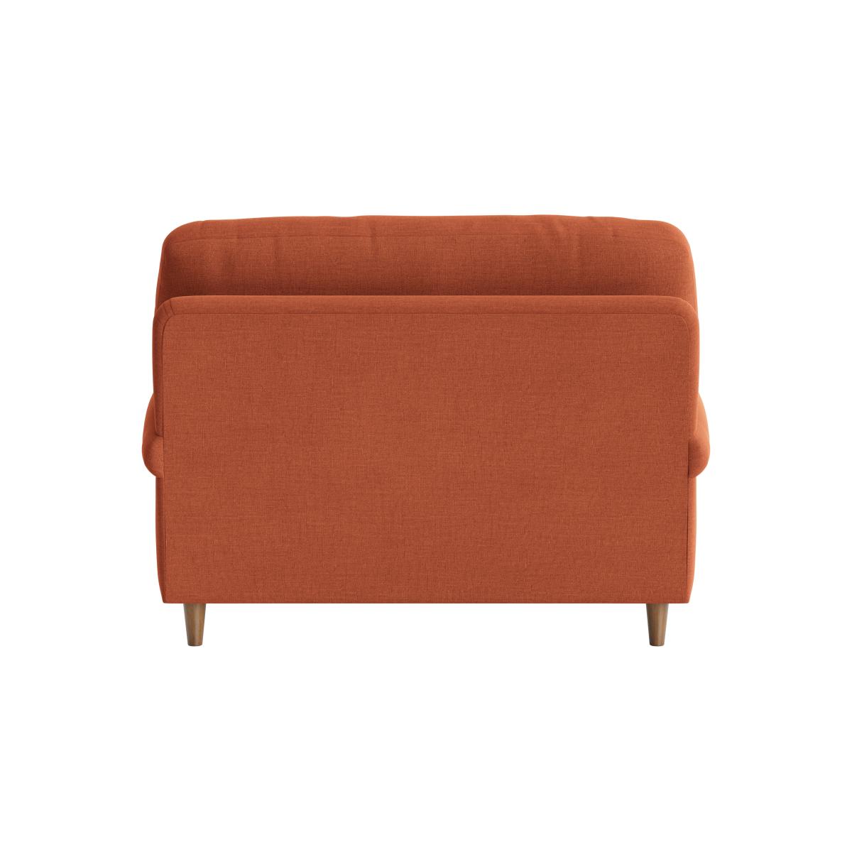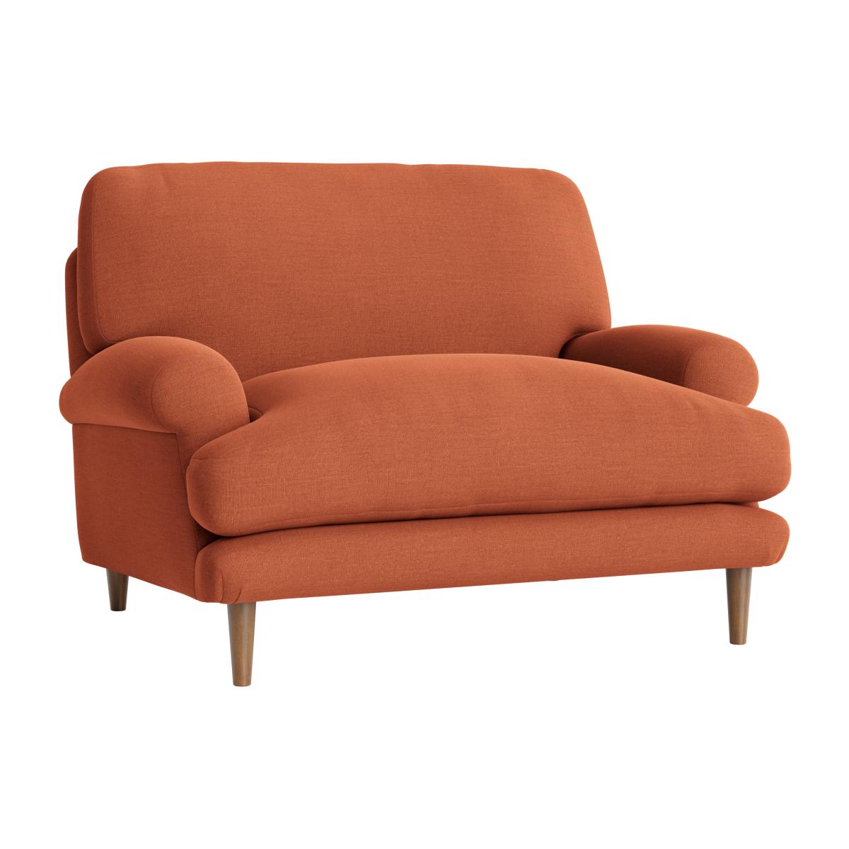 I love this love seat for its relaxed, inviting shape and warm terracotta hue, which makes it a versatile piece for both modern and traditional interiors. It works especially well in eclectic or laid-back schemes, adding a pop of colour without dominating the space. Practical styling tips include pairing it with neutral-toned cushions or textured throws to soften its look, and setting it against a patterned or plain wallpapered wall for visual interest. Its slightly rounded arms and simple mid-century legs give it a cosy yet timeless appeal, making it ideal for smaller living rooms or cosy corners where comfort is key.