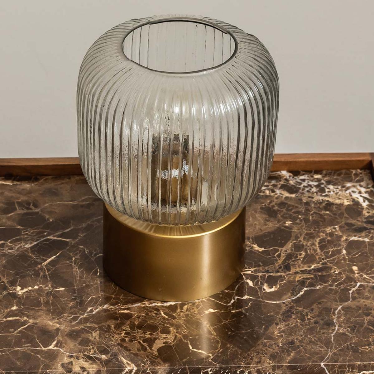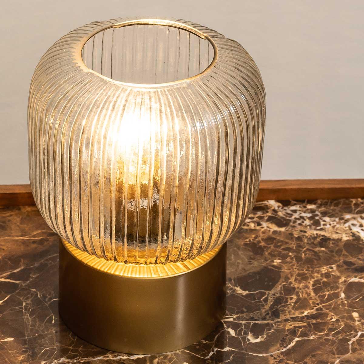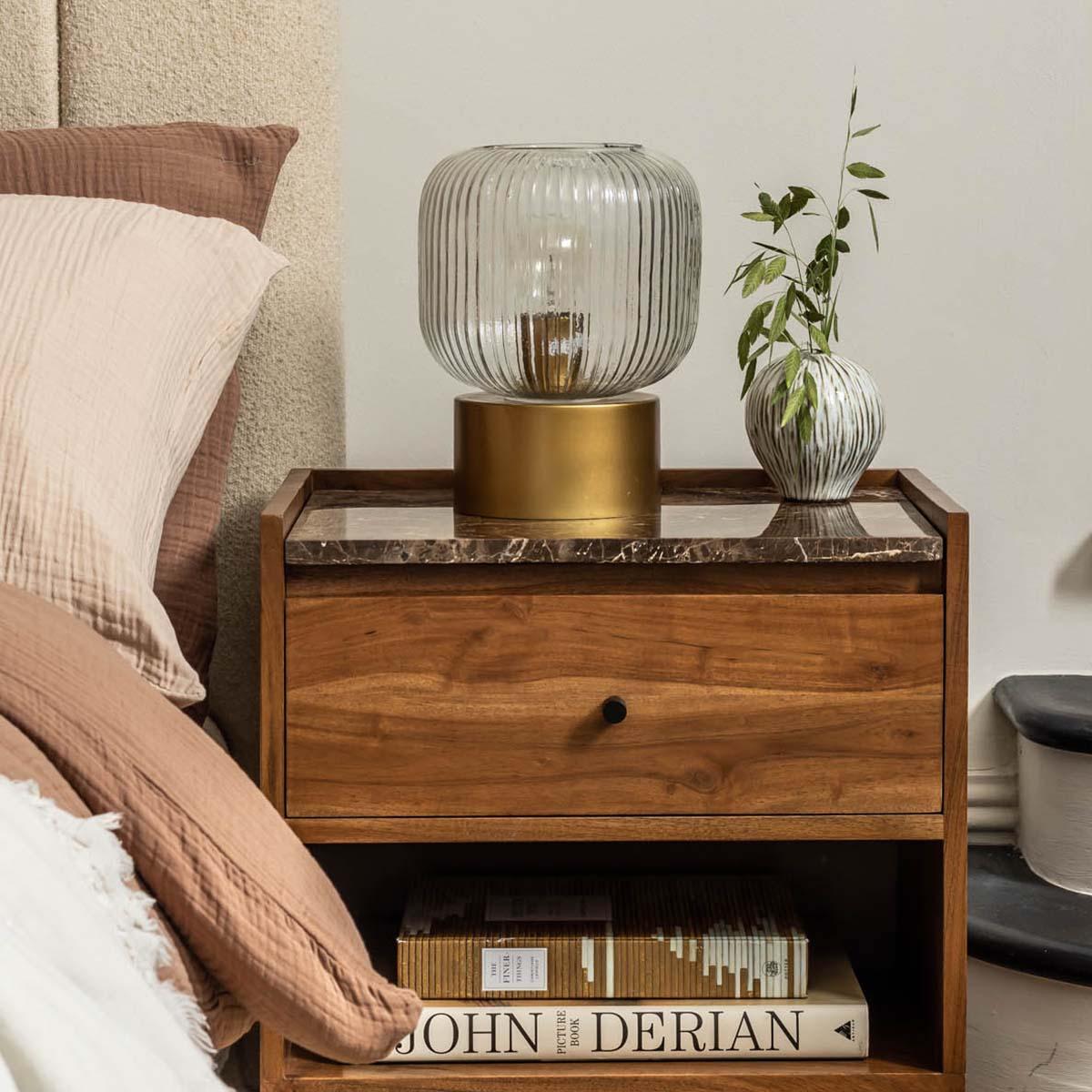 I’m a big fan of this lamp for its fluted glass shade and warm brass-toned base, which casts a soft, welcoming glow ideal for a bedroom or living room corner. It sits happily in Scandi-inspired schemes, modern-classic or mid-century styled spaces, adding a subtle sculptural element without overwhelming. For practical styling, place it on a pared-back wooden bedside table alongside a stack of books and a small ceramic vase, or team it with darker accessories on a console to create a layered, balanced look.