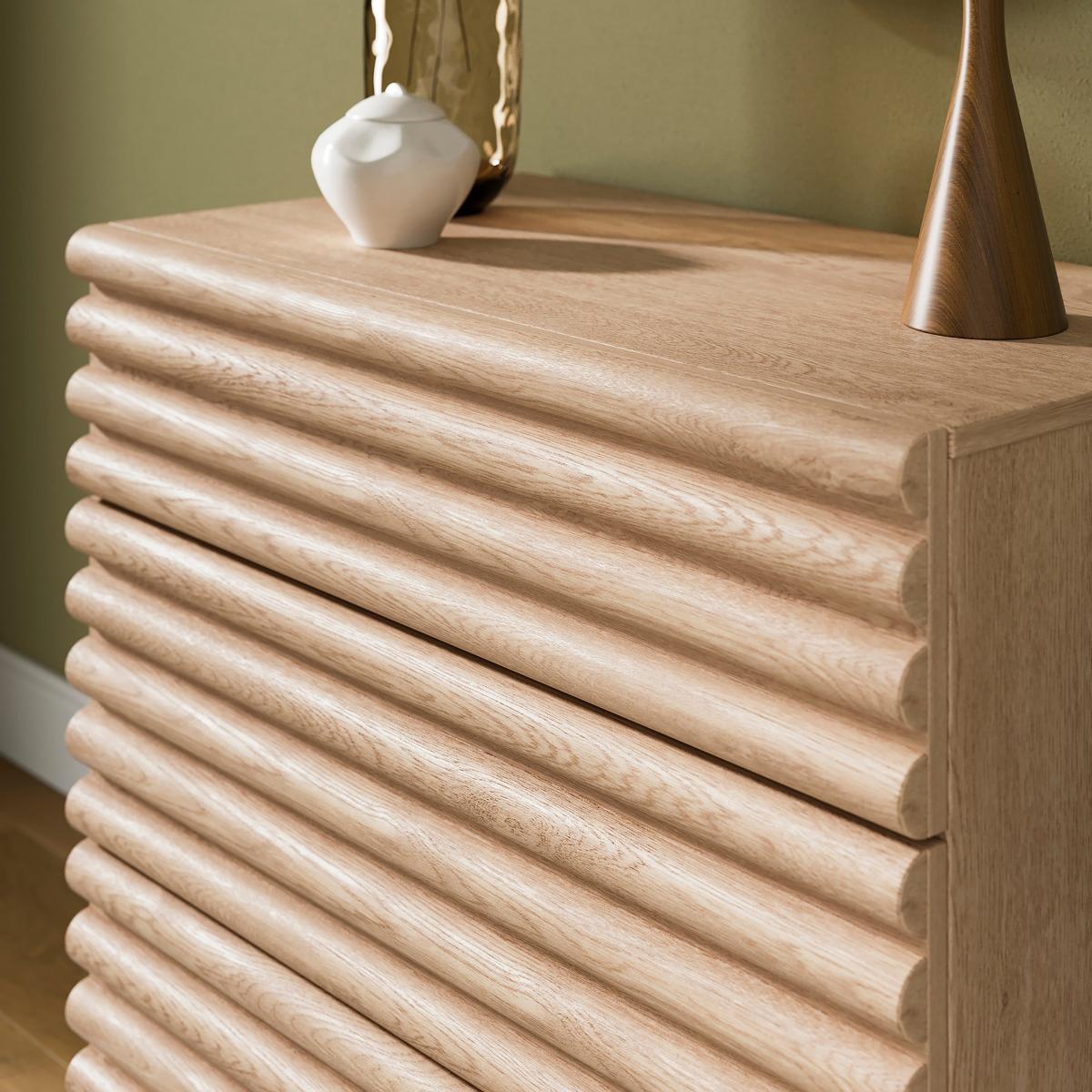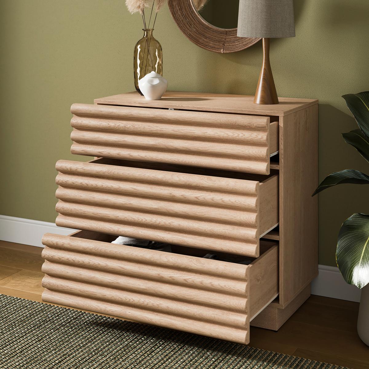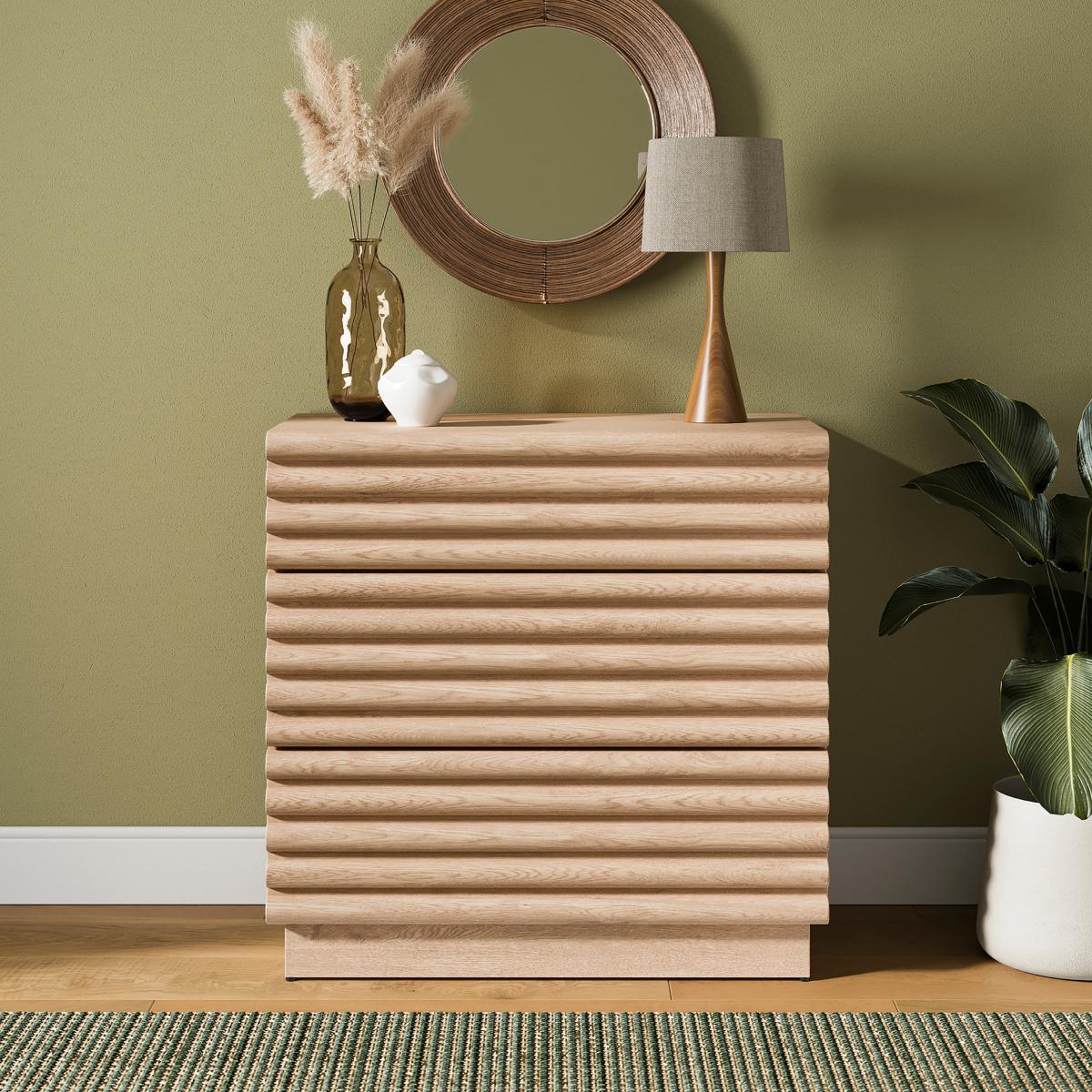 I’m a fan of the Dax chest for its lightly distressed oak and ribbed drawer fronts - it brings texture without overwhelming a space. Its compact three-drawer layout makes it equally at home as a hallway catch-all, bedroom bedside or living-room storage unit. Styling-wise, pair it with a round mirror or sculptural lamp, plus a couple of vases in differing heights (think glass or muted ceramics) and a touch of greenery or dried grasses. It works well in Scandi, coastal or contemporary boho schemes - just keep accessories minimal and tuck a small basket underneath to boost practicality.