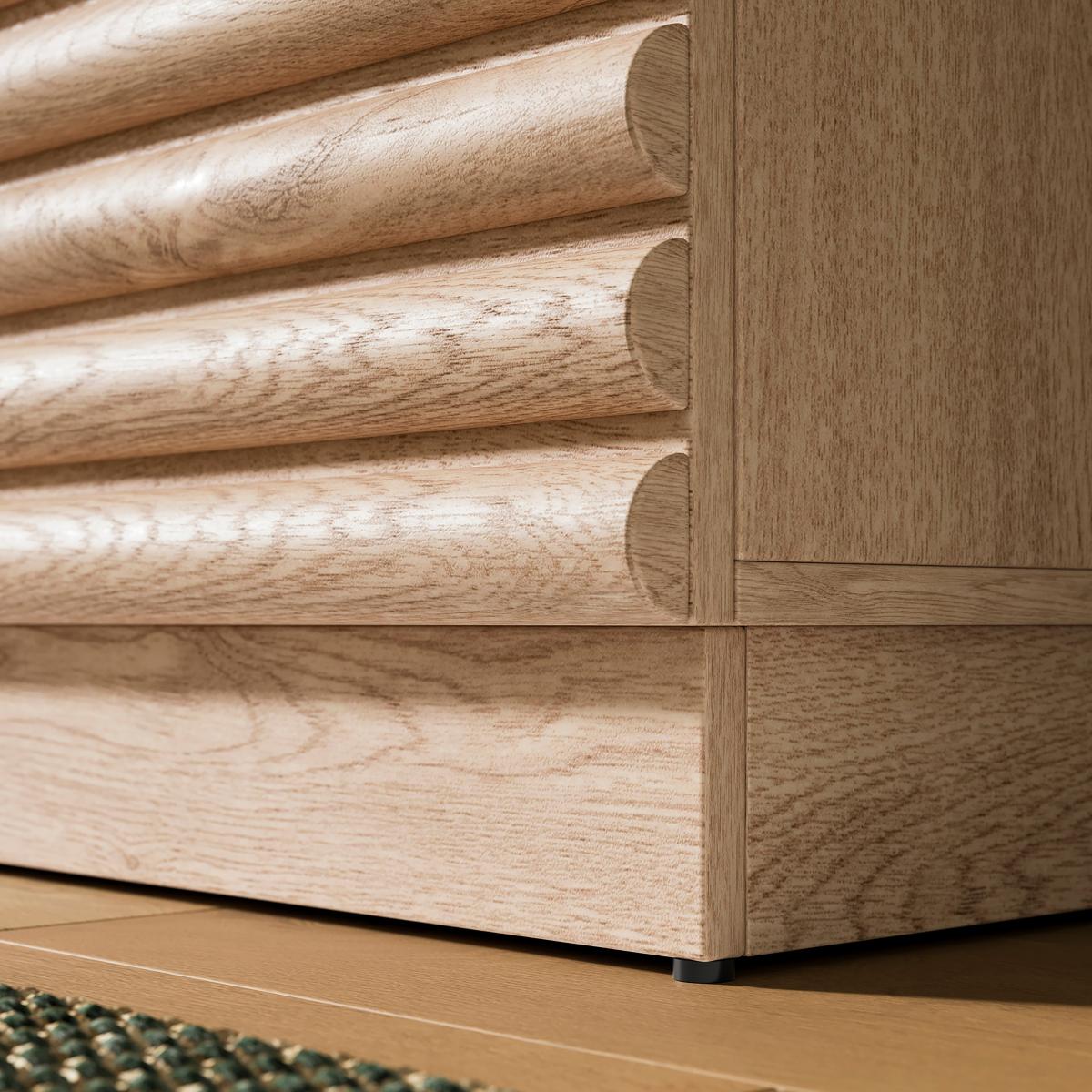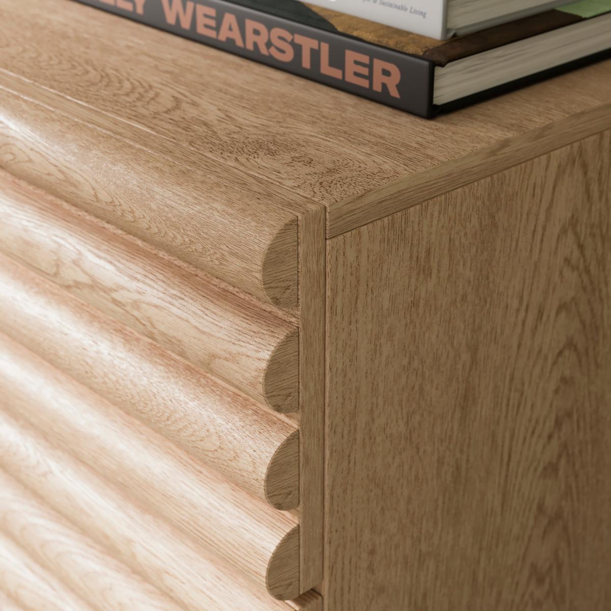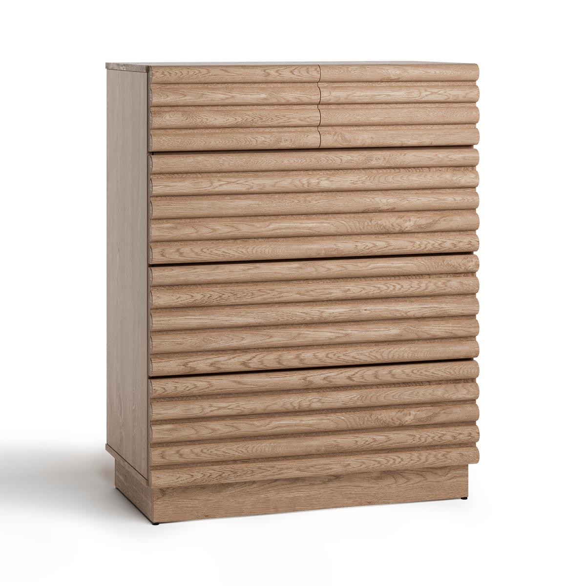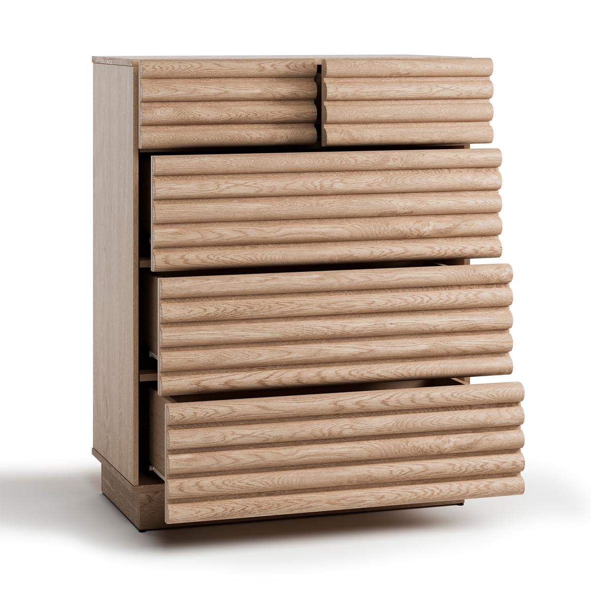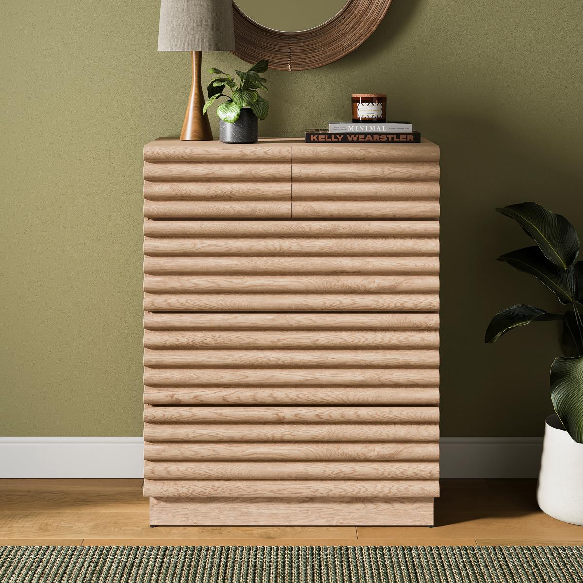 I’m a big fan of the Dax chest (the five-drawer oak unit) because its lightly distressed finish adds texture without dominating the room. It sits equally well in Scandi-inspired bedrooms, coastal retreats or pared-back city flats. For styling, keep the top clear except for a single lamp and a low vase or two books to maintain that airy feel, and tuck a woven basket beside it for extra storage. In a hallway, use it as a drop-zone - add a shallow tray for keys, a mirror above and a small plant to bring the scheme together.