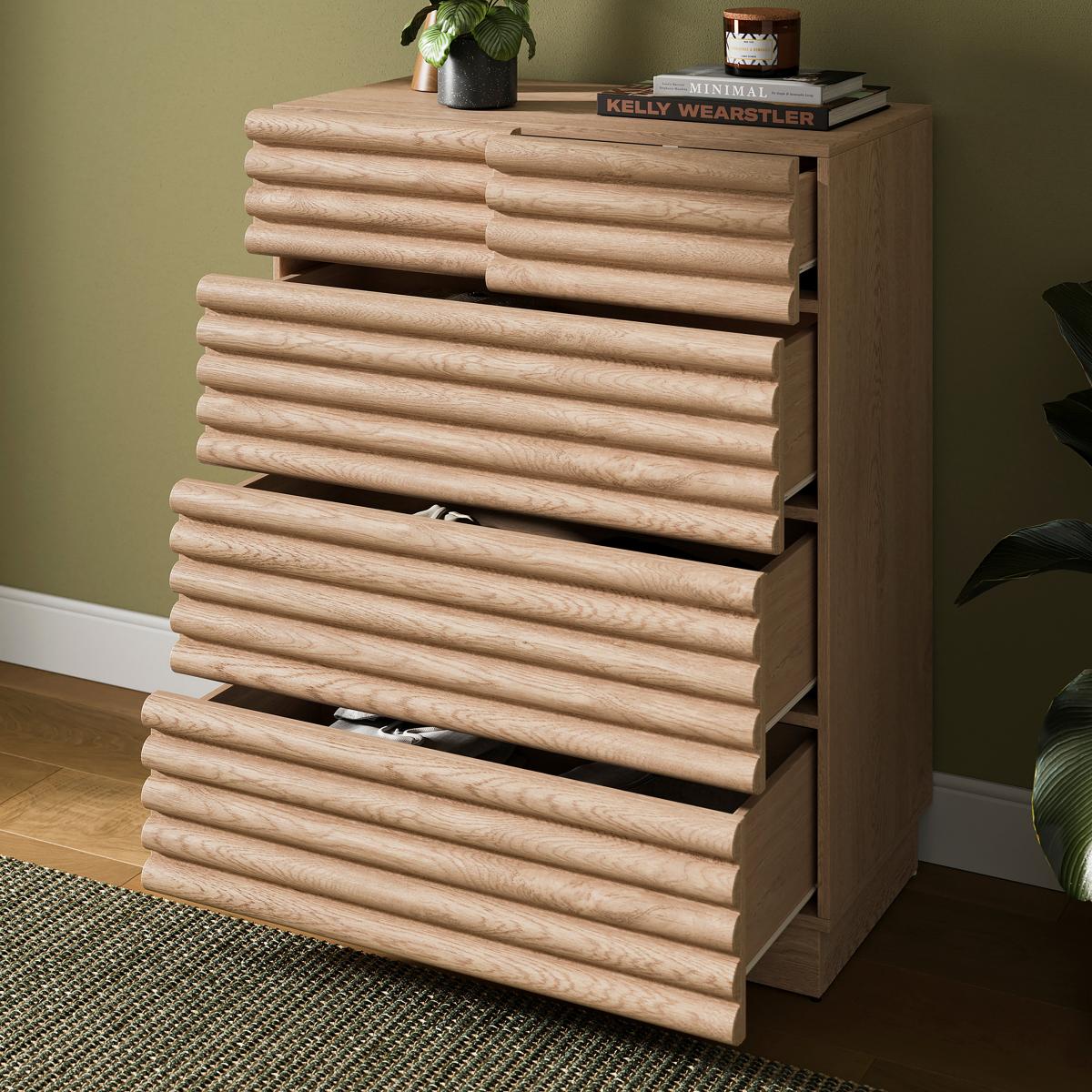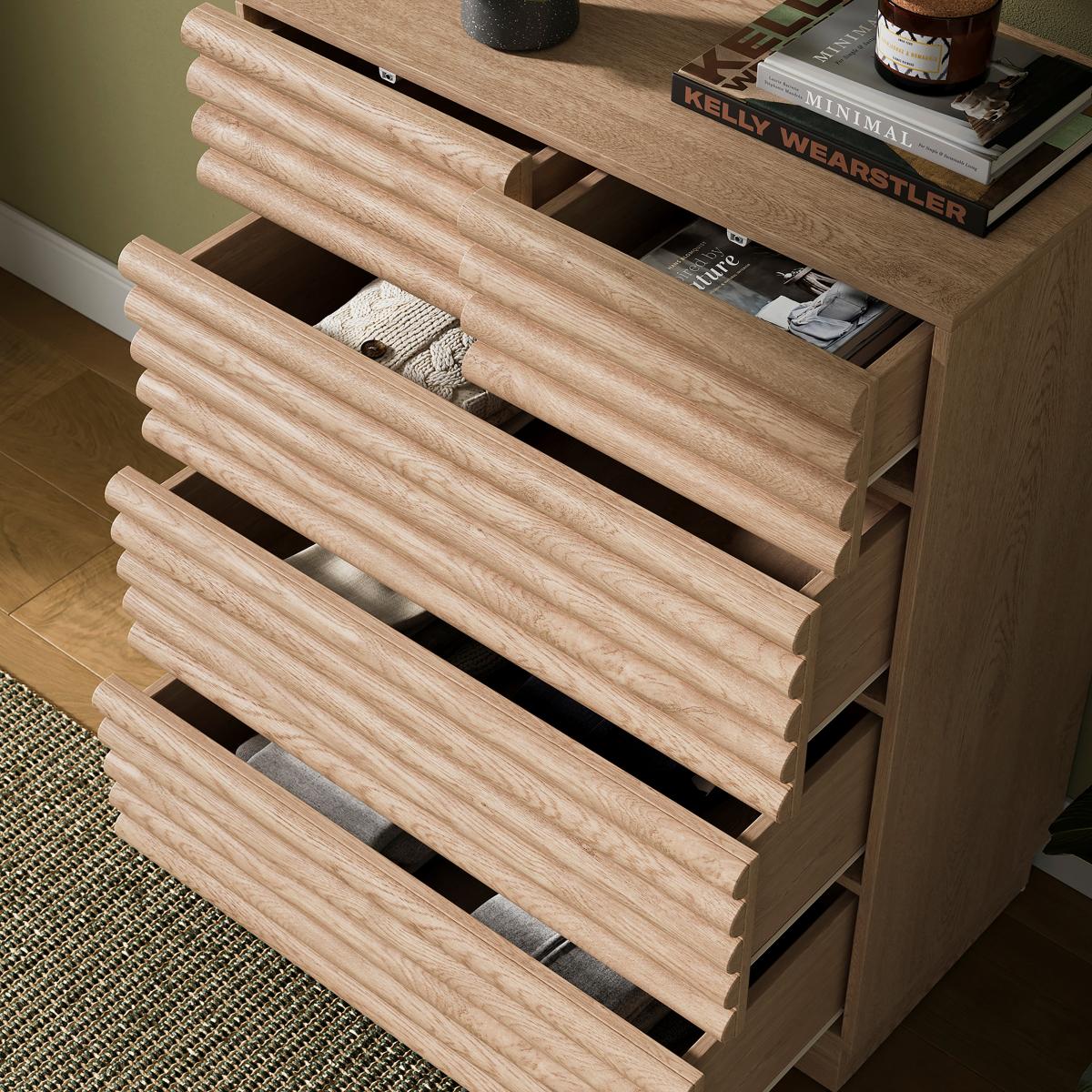 Dunelm Exclusive - Designed and Developed by Dunelm* Wooden Chest of Drawers* Metal Runners* 5 Large Drawers This chest is crafted to enhance your bedroom decor, featuring five spacious drawers that provide ample space for organising your wardrobe essentials. The contemporary design of the Dax Chest is complemented by a rich oak finish, creating a focal point that seamlessly integrates with various interior styles. The Dax drawers prioritise functionality with the inclusion of undermount metal runners, ensuring smooth and silent drawer operation for a touch of sophistication to your daily routine.