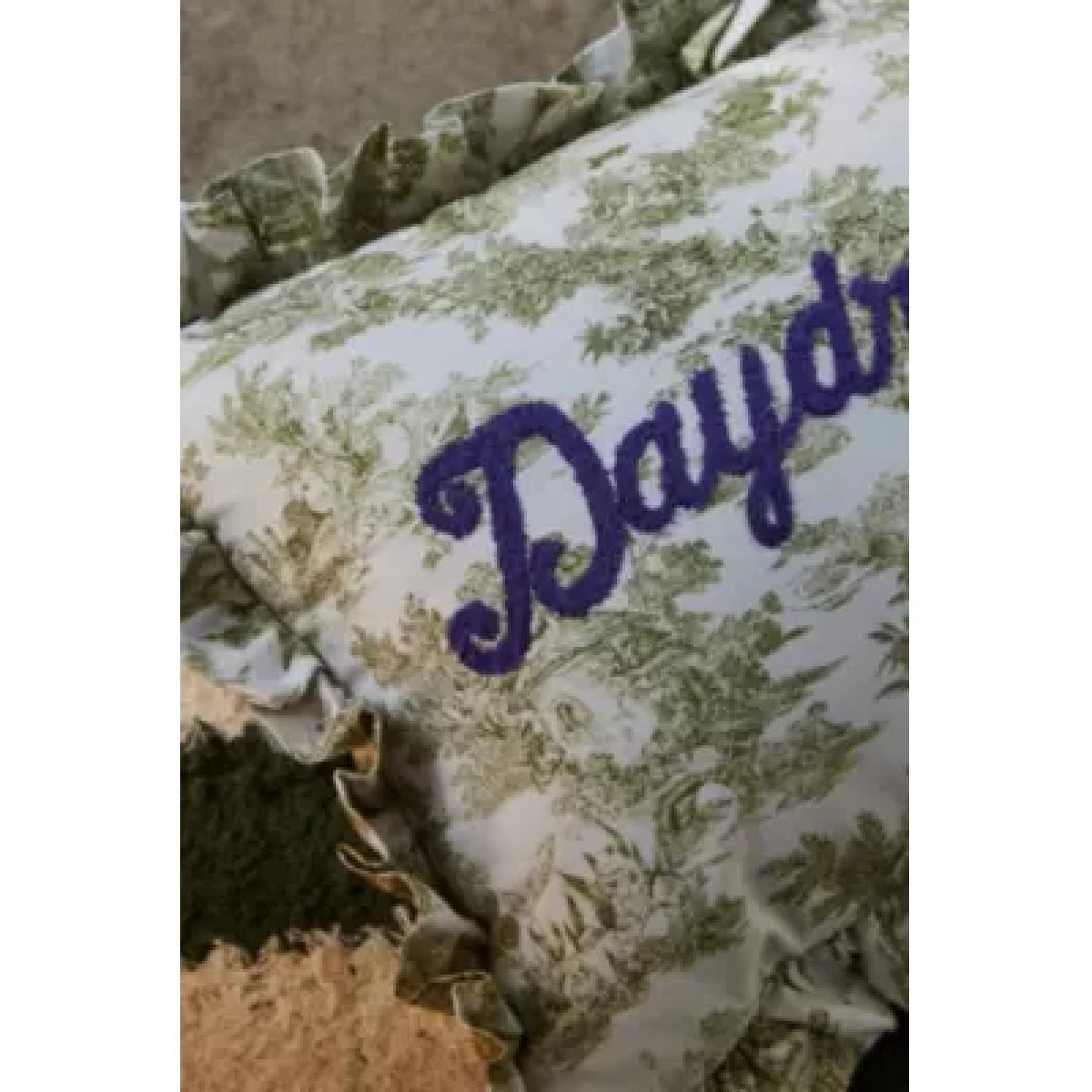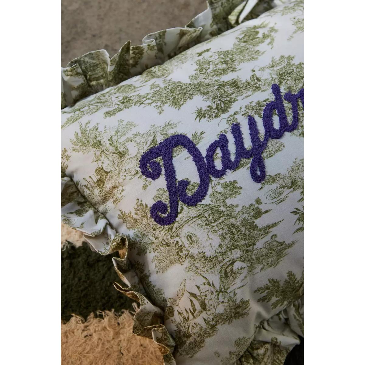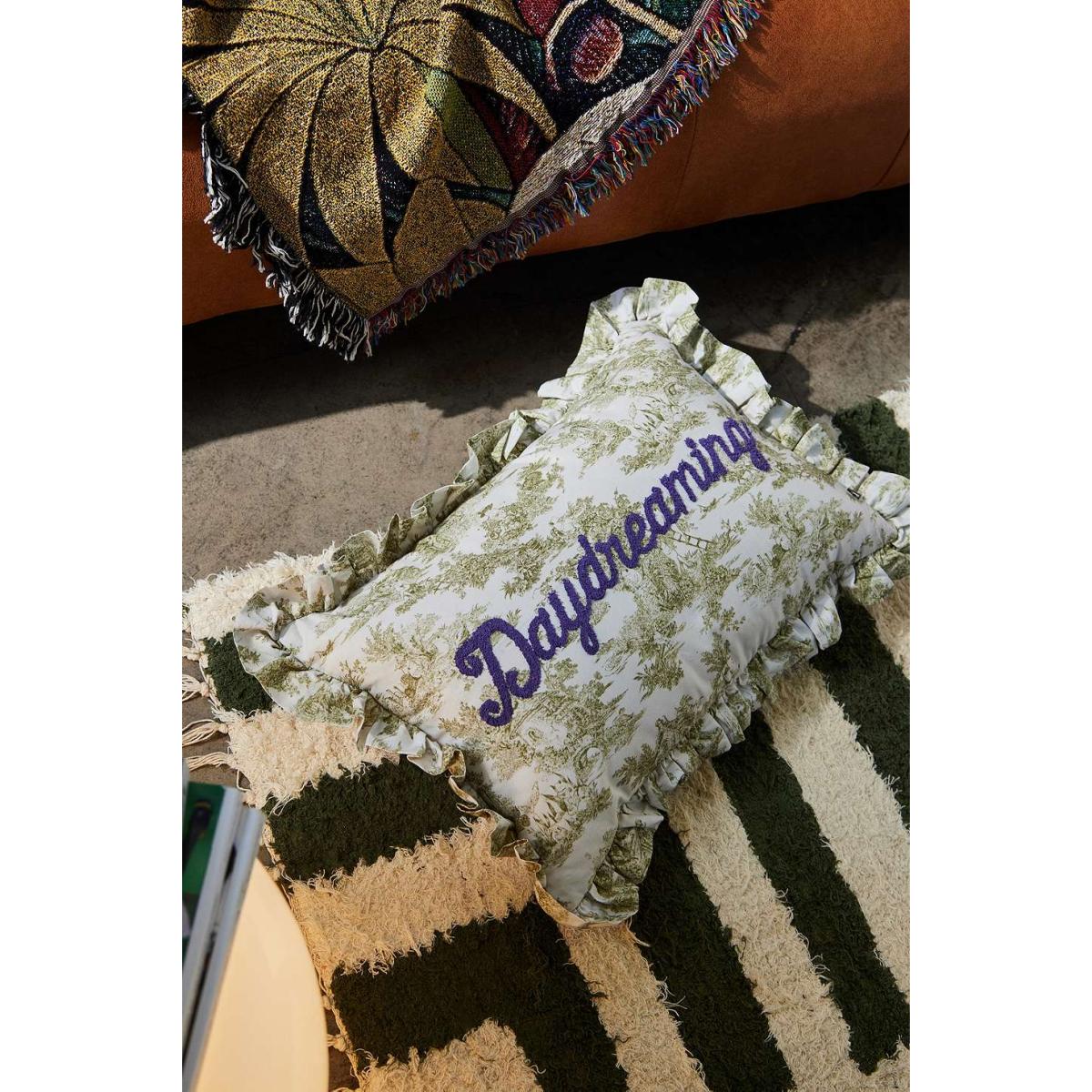 Have the sweetest dreams with this romantic toile pillow. Antique style complete with a ruffle trim and tufted 'daydreaming' motif. **Content + Care** \- 100% Cotton \- Spot clean