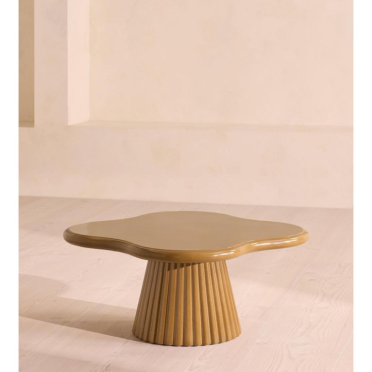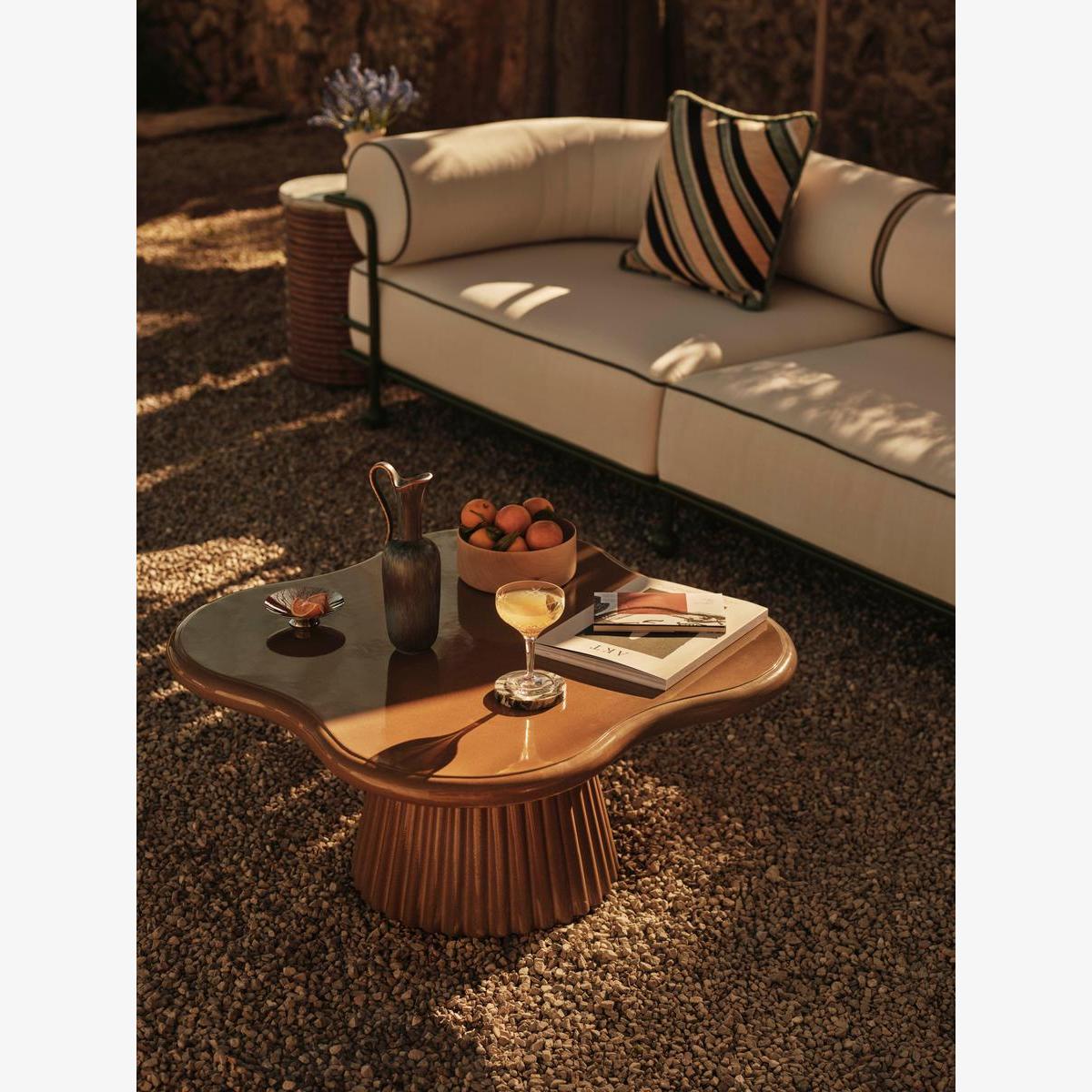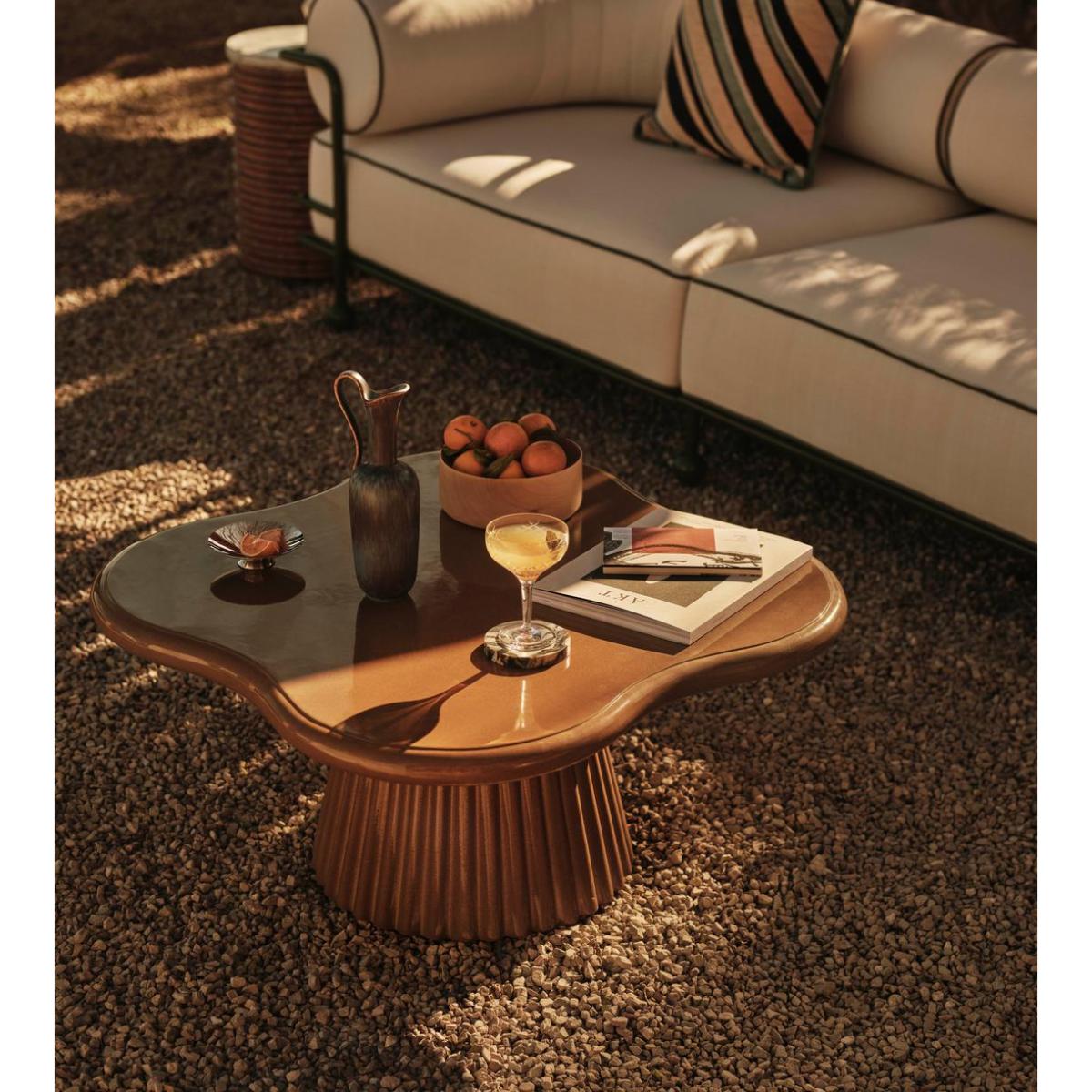 Designed for outdoor use, a sculptural, clover-shaped top is finished with a unique reactive glaze. Etched with reeded detailing, the tapered pedestal base of our Dayton coffee table supports a clover-shaped top. Its sculptural silhouette is crafted from reinforced concrete finished with a one-of-a-kind reactive glaze to harmonise with outdoor surroundings.