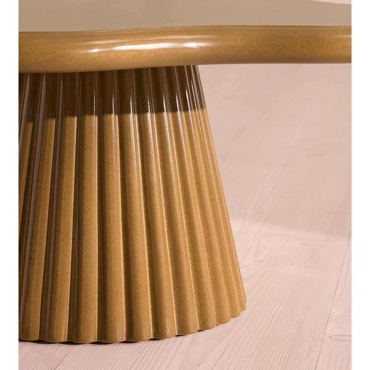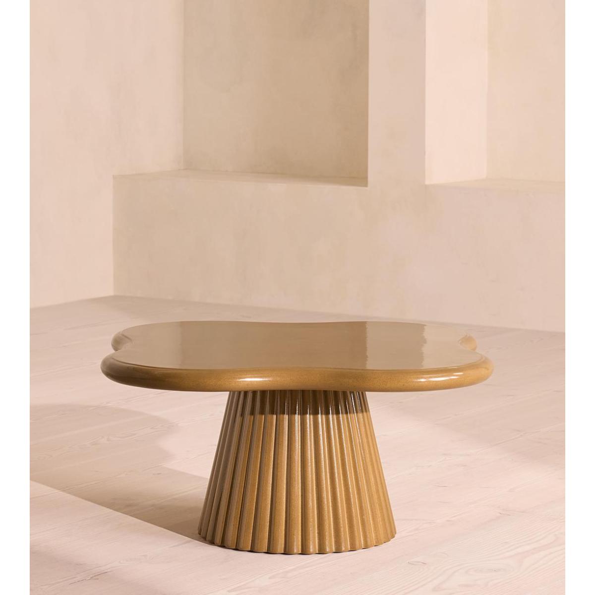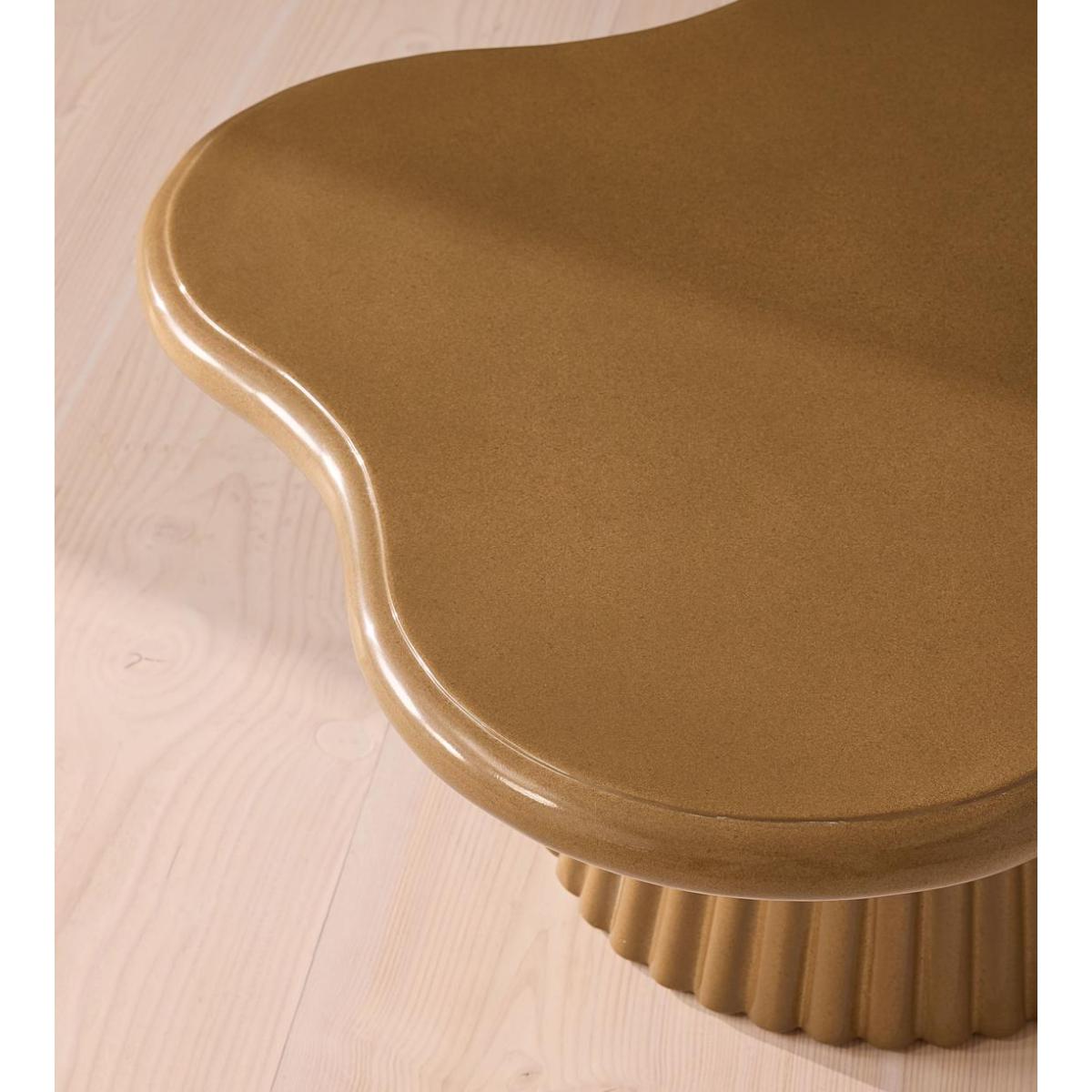 Designed for outdoor use, a sculptural, clover-shaped top is finished with a unique reactive glaze. Etched with reeded detailing, the tapered pedestal base of our Dayton coffee table supports a clover-shaped top. Its sculptural silhouette is crafted from reinforced concrete finished with a one-of-a-kind reactive glaze to harmonise with outdoor surroundings.