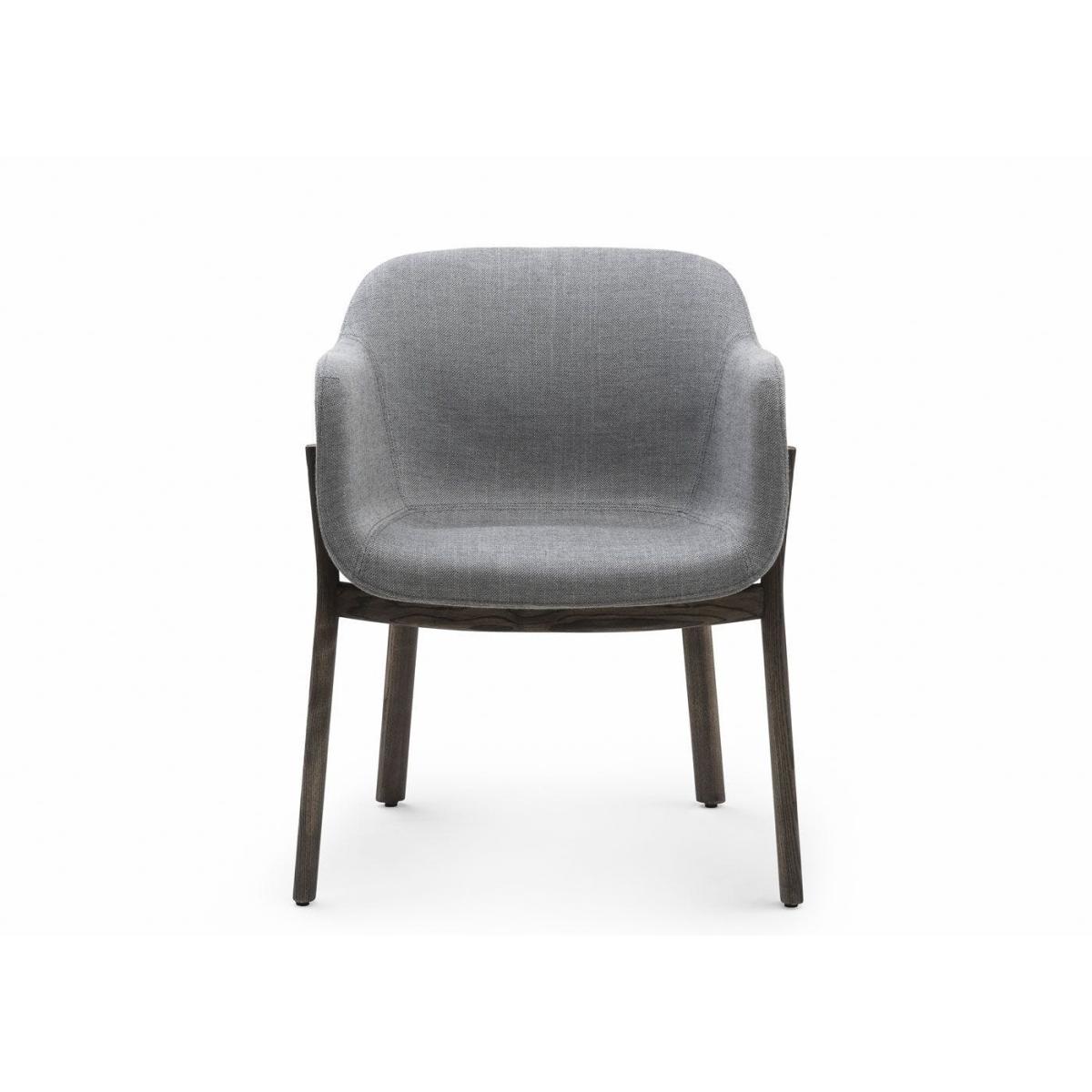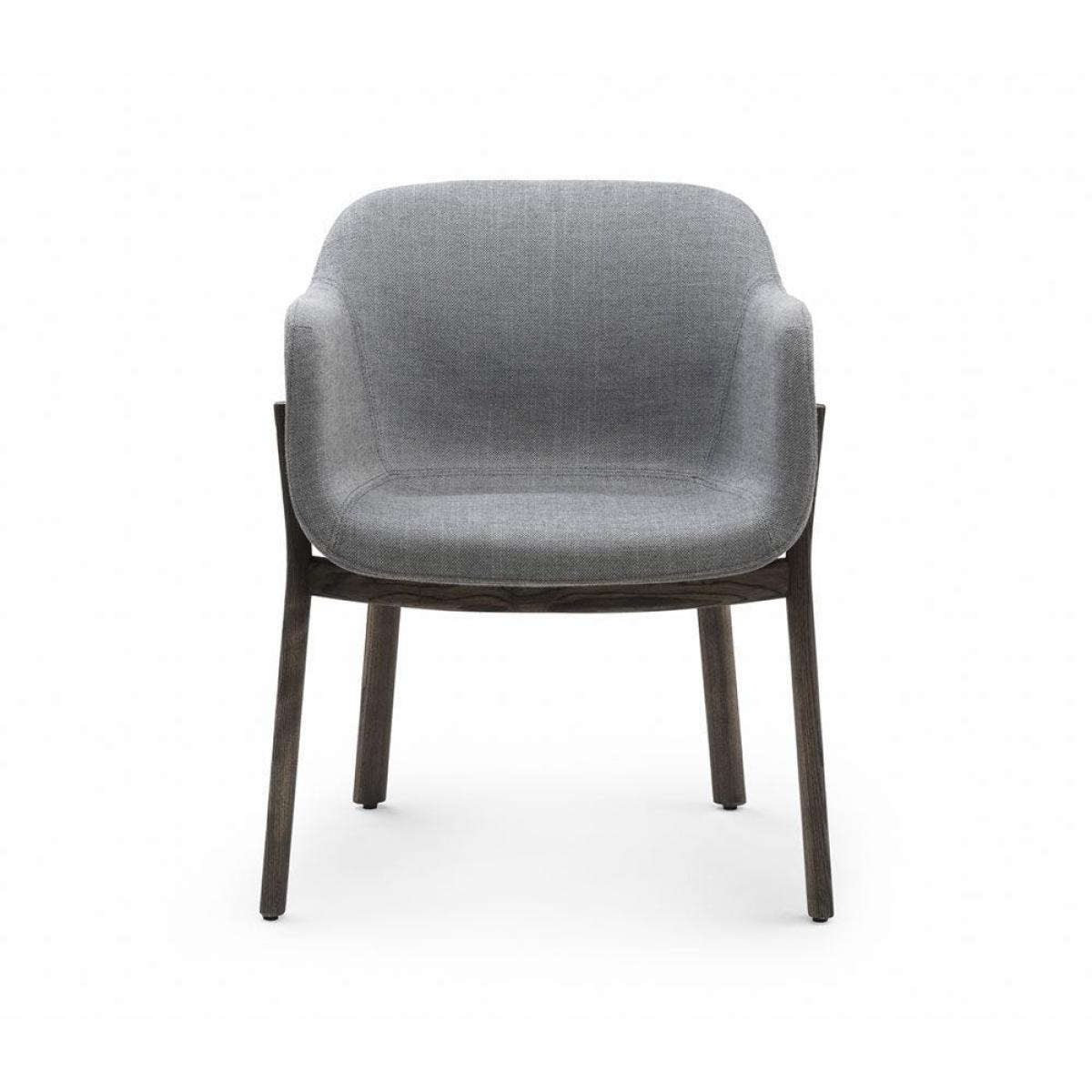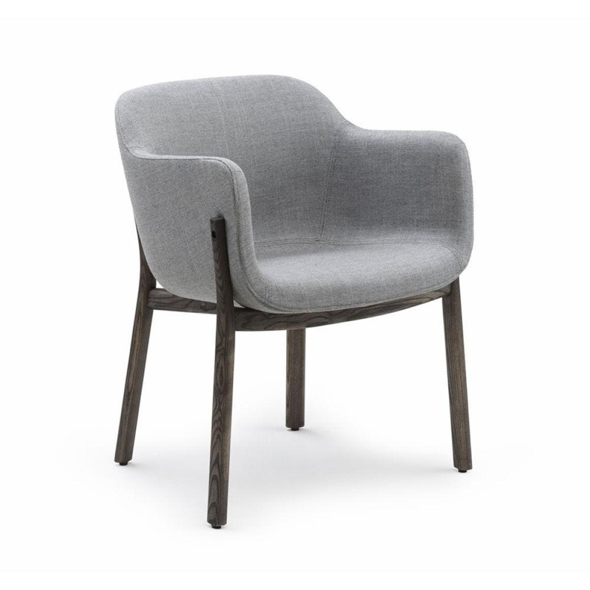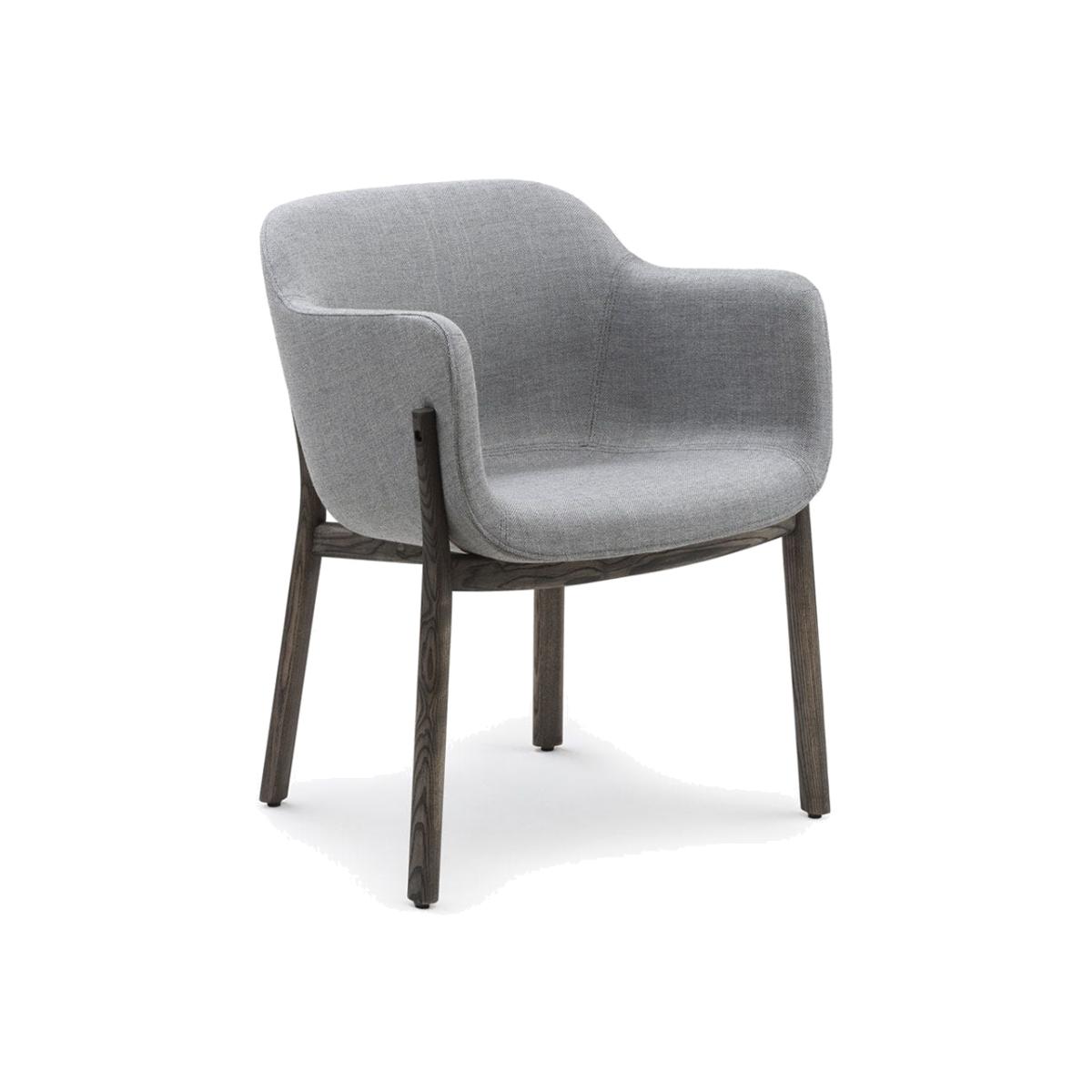 Designed by Matthew Hilton for De La Espada, the 388 Porto Dining Chair boasts a Danish oiled ash base with grey Sunniva 2 242 upholstery. Ideal for dining spaces, this comfortable tub chair boasts a wraparound form that creates a supportive and relaxing sit. Cold cure foam padding provides further comfort and helps to create the curving shape. The chair is upholstered in Kvadrat’s Sunniva 2 fabric in a grey finish. Designed by Raf Simons and Fanny Aronsen, Sunniva 2 is woven using a new wool blend that lends the fabric a textural finish.