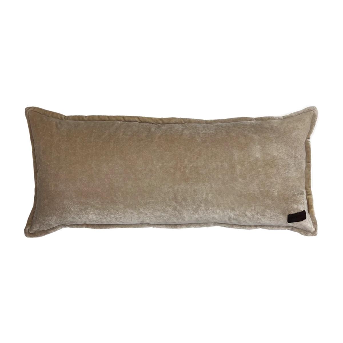 This generous, oblong cushion is made from a combination of two contrasting fabrics juxtaposing the refined with the raw. On the face a plush, long pile velvet with a crushed, mottled lustre. On the reverse, Seed Linen, is a 100% linen cloth with subtle nuances and slubs. Perfect for a sofa or a bed this sophisticated cushion is finished with a smart self-flange detail on all sides, and a hand embossed butter-soft leather badge hand stitched to one corner. Supplied with a dust bag made in GOTS certified cotton fabric with waxed cotton cord ties. Duck feather and down cushion pad included. Duck feather and down cushion pad included.