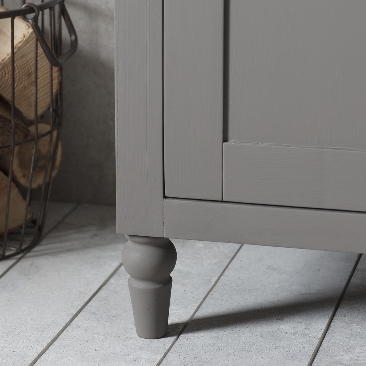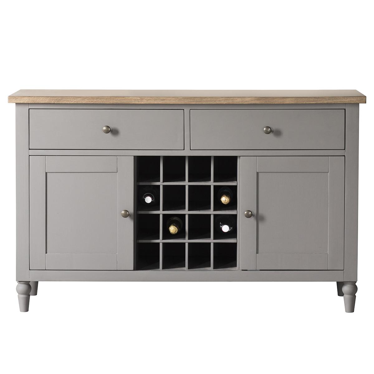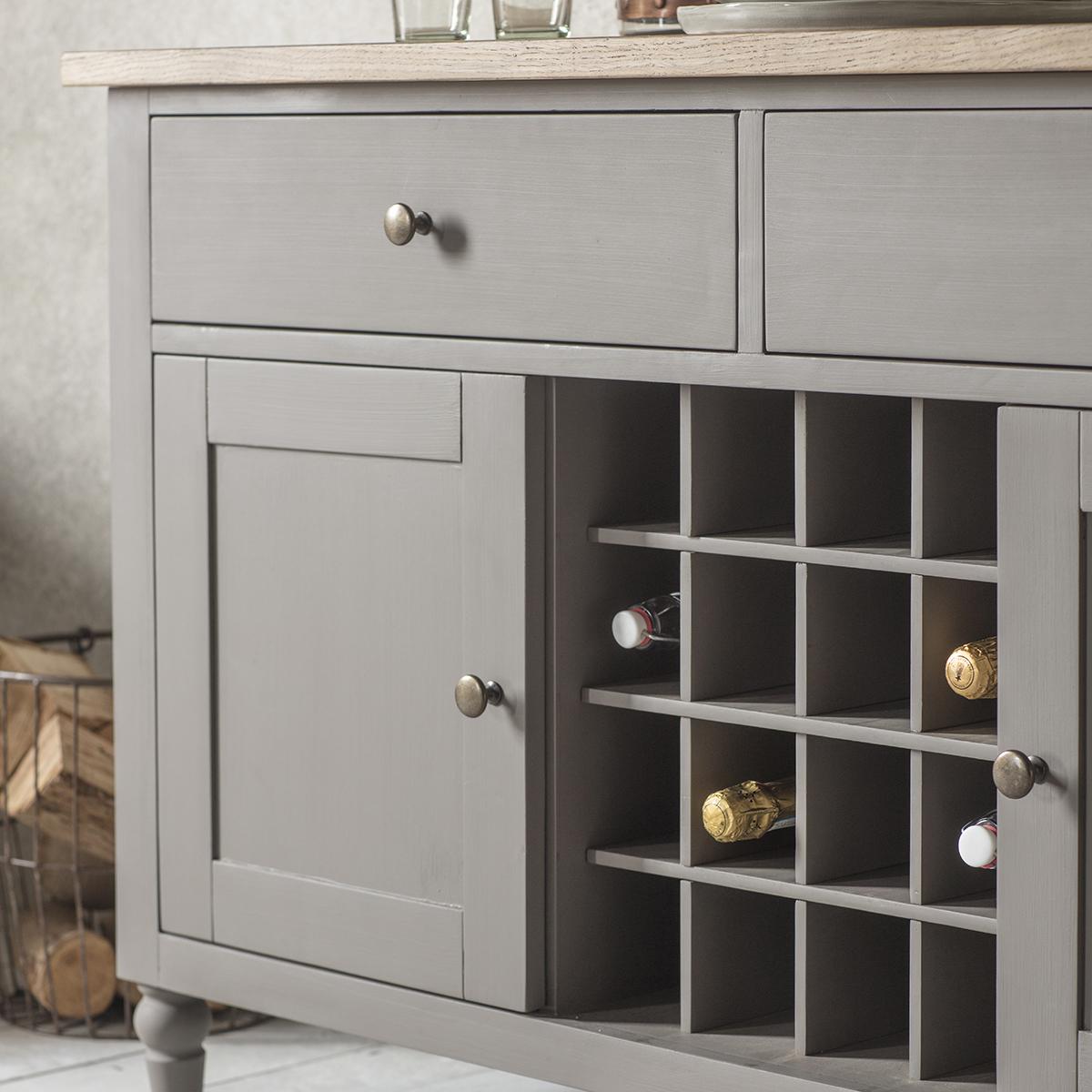 The Dean Large Sideboard in Grey features a built-in wine rack, 2 cupboards, each with a shelf, and 2 drawers for a stylish, practical storage solution. It offers an updated farmhouse kitchen style, and is painted in a lovely slate grey with a smoky oak top.