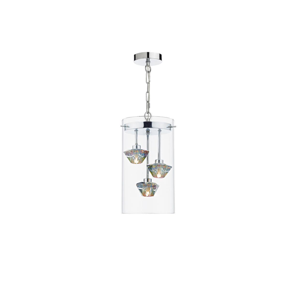 This eye-catching ceiling pendant makes fabulous use of lustrous colour-changing dichroic glass and a cylindrical glass outer shade to successfully combine vintage and contemporary influences. Striking glass ceiling pendant with magical colour-changing lights. Vintage-inspired style with contemporary flair. Inner shades are made of colour-refracting dichroic glass. Clear glass cylinder suspended by a metal chain. Shiny chrome fixtures. Part of the Furniture Village lighting collection. What you need to know. Glass and metal construction. Height adjustable on installation. Requires three G9 capsule bulbs, maximum 25W (not supplied). Dimensions. Width: 20 cm (xx inches). Height: 45 – 145 cm (1xx inches).
