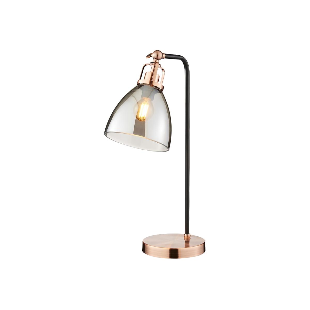 Decan is an industrial effect family featuring ceiling pendants, table & floor lamps and wall lamp. Brushed copper detail with smoked glass shades.