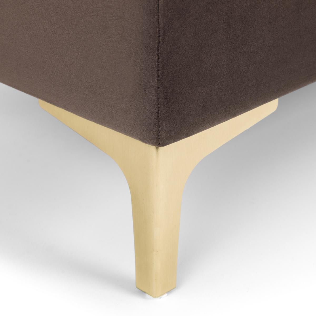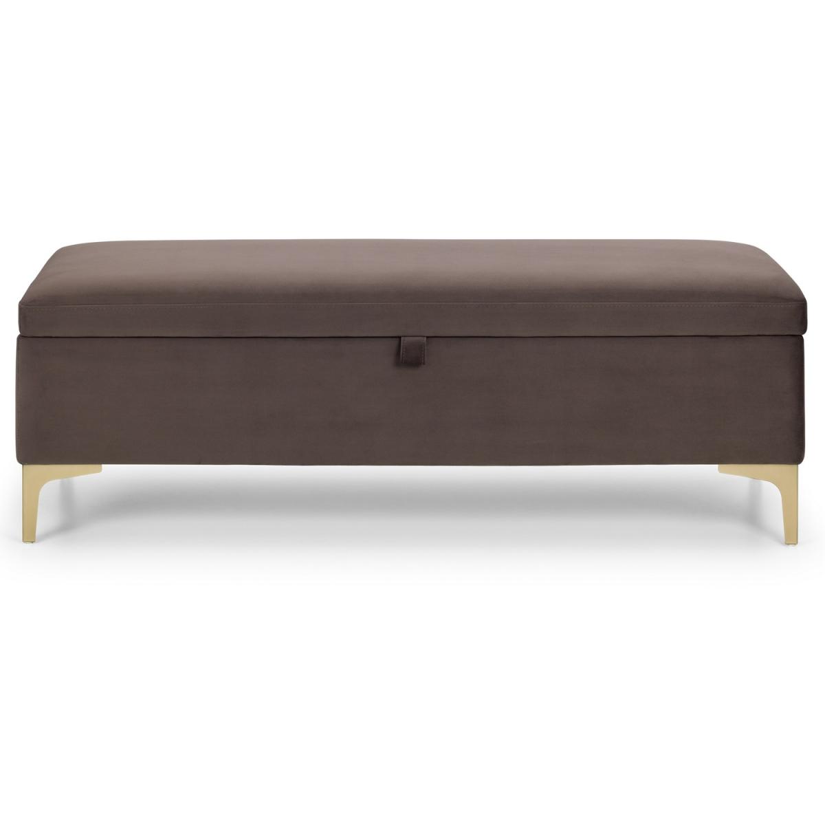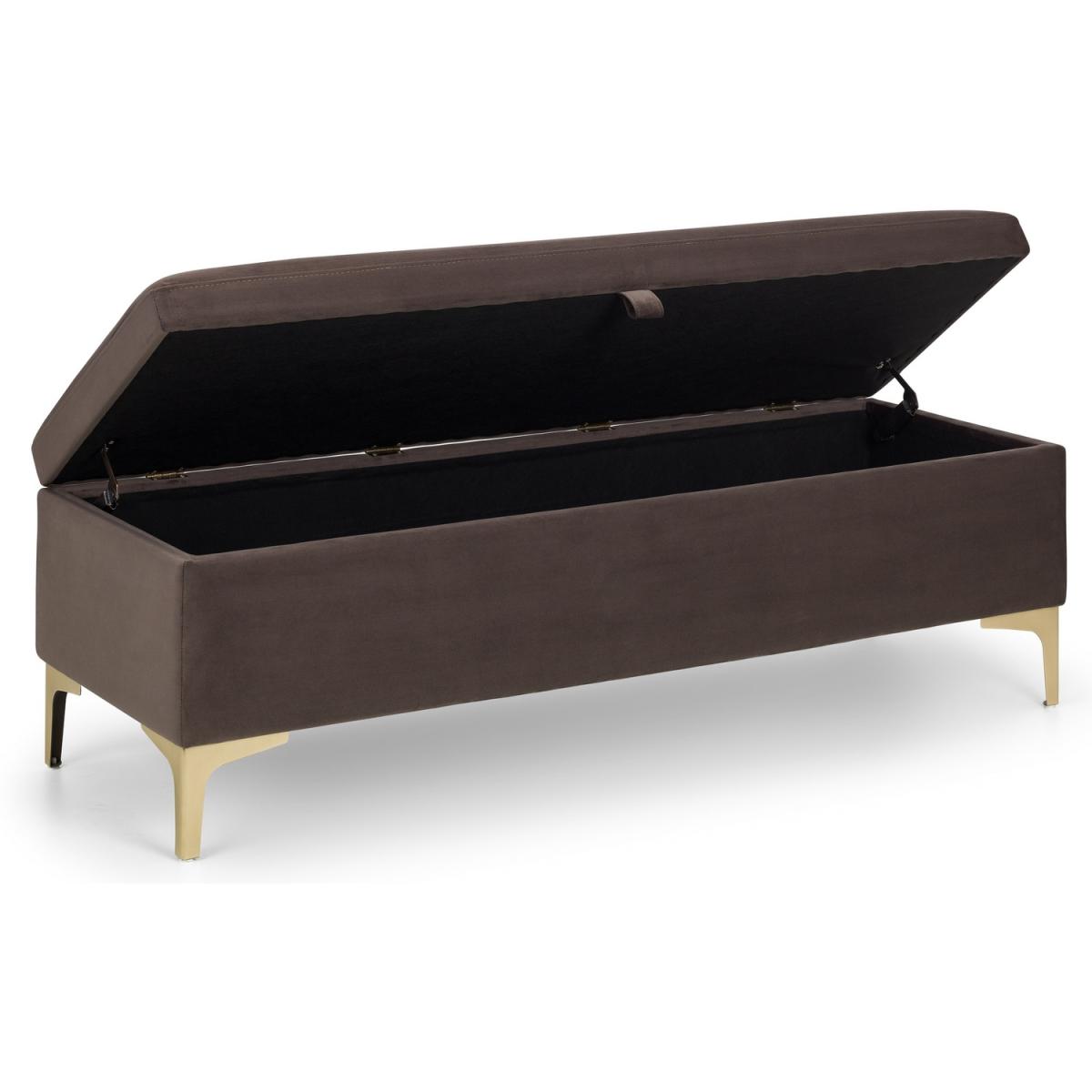 Perfectly proportioned to sit at the end of the Julian Bowen Deco bed, this contemporary Deco blanket box is upholstered in a truffle velvet fabric with complimentary gold metal legs. This contemporary design offers a unique, timeless appeal. The perfect storage for your cushions, linens, or duvets with the ease of soft close hinges.