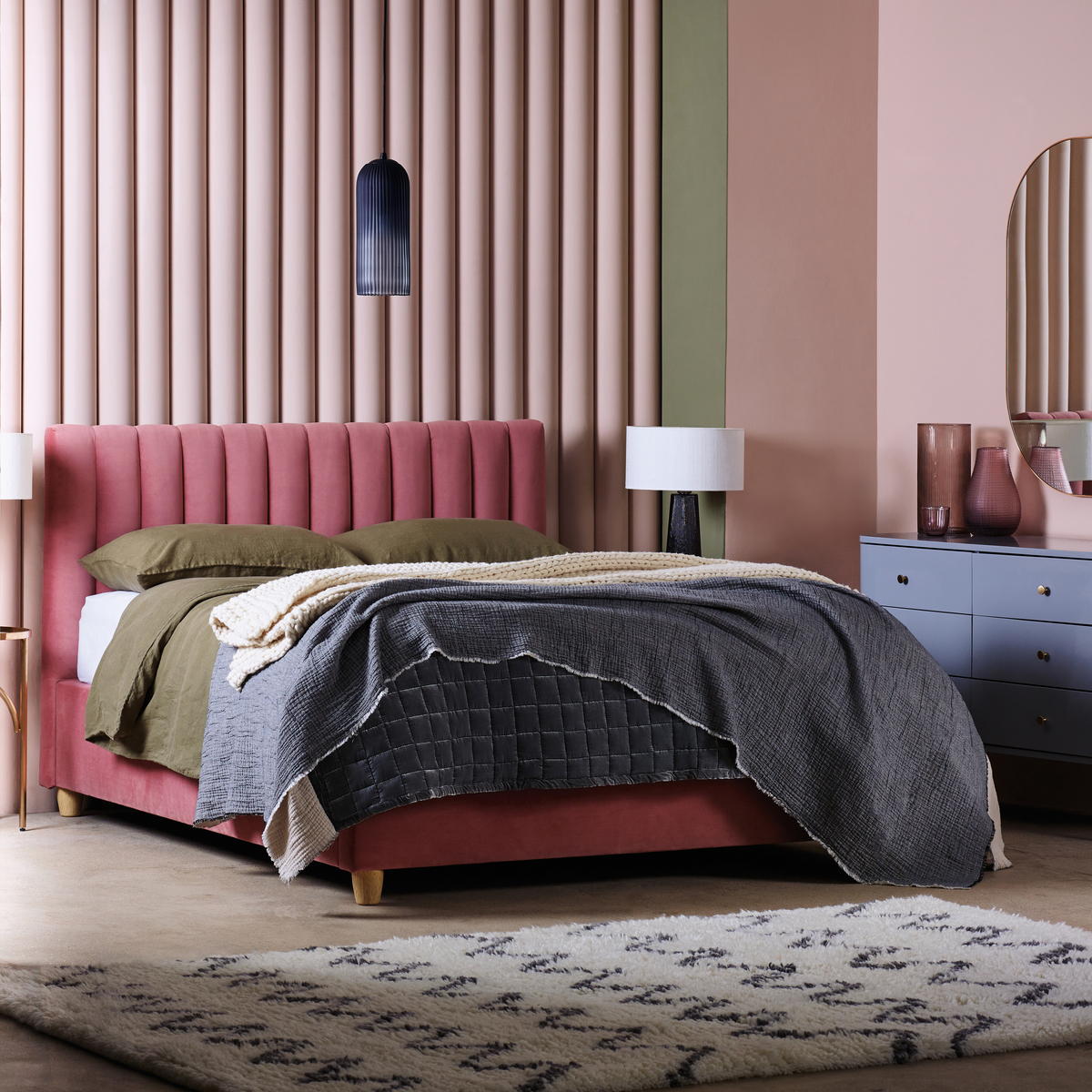 Upholstered in plush velvet for big visual impact, make your morning a little more luxurious with the Deco grey velvet double bed. A modern update on a classic fan-shaped headboard, the deeply padded design’s pulled detailing is matched harmoniously with the bedframe’s solid wood legs, padded sides and sleek modern proportions. With a deep pile and soft-to-touch fabric, each art deco headboard and bed are upholstered by hand resulting in a cleaner, more opulent finish. The soft fabric offers an updated vintage feel to your bedroom alongside stability and comfort and works best paired with muted toned bedding. Adorn Deco with cushions and throws for a cosy, finished look. Part of the Deco range, the bed is available in a pink velvet finish and as a kingsized bed frame.