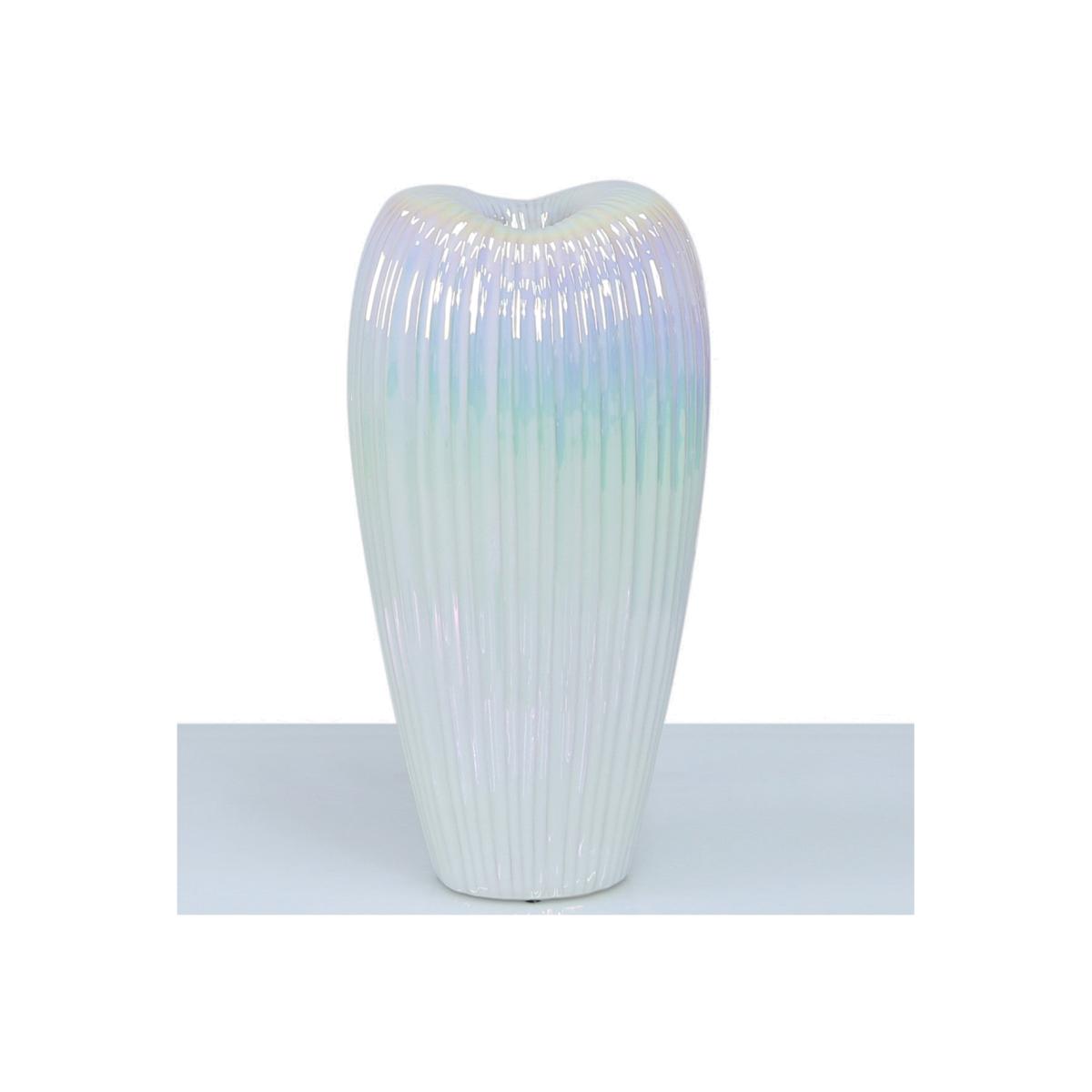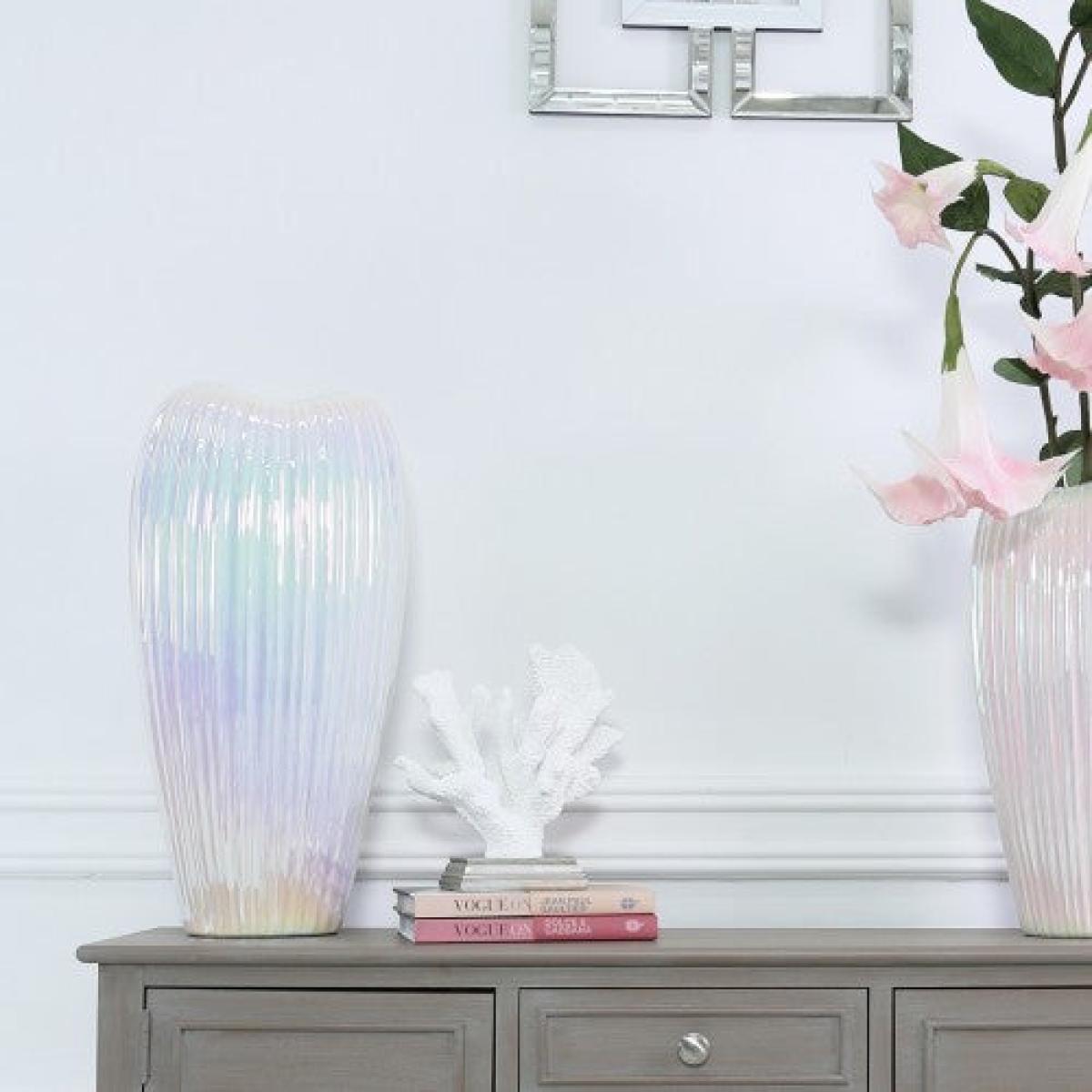 Showcase luxury style in any display with the impressive pearl pink ribbed vase. Featuring a ceramic construction with a pearl pink shade. Use as a stand alone piece or accentuate with flowers.