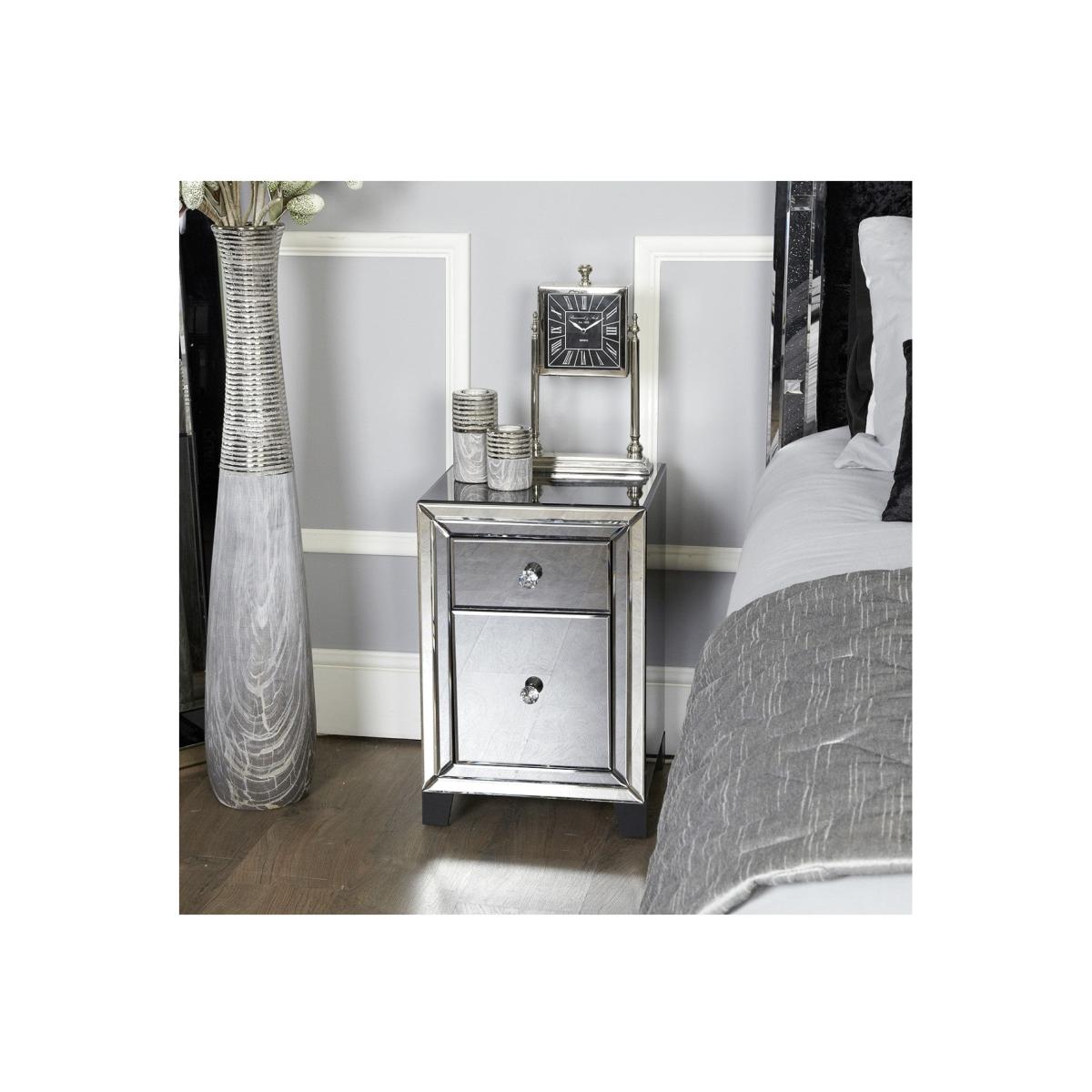 I love this bedside cabinet for its striking black smoked glass finish, which adds a touch of modern sophistication to any room. Its mirrored surface enhances light reflection, making it ideal for smaller spaces or rooms with limited natural light. The ‘Arctic Noir’ look works well in contemporary, art deco, or even industrial interiors, particularly when you want to introduce a bold statement piece. Practical styling tips include pairing it with metallic accents or monochrome linens for a cohesive look, and keeping the top uncluttered to let its reflective surface really stand out. The two drawers also offer handy storage without taking up too much space, making it as functional as it is stylish.