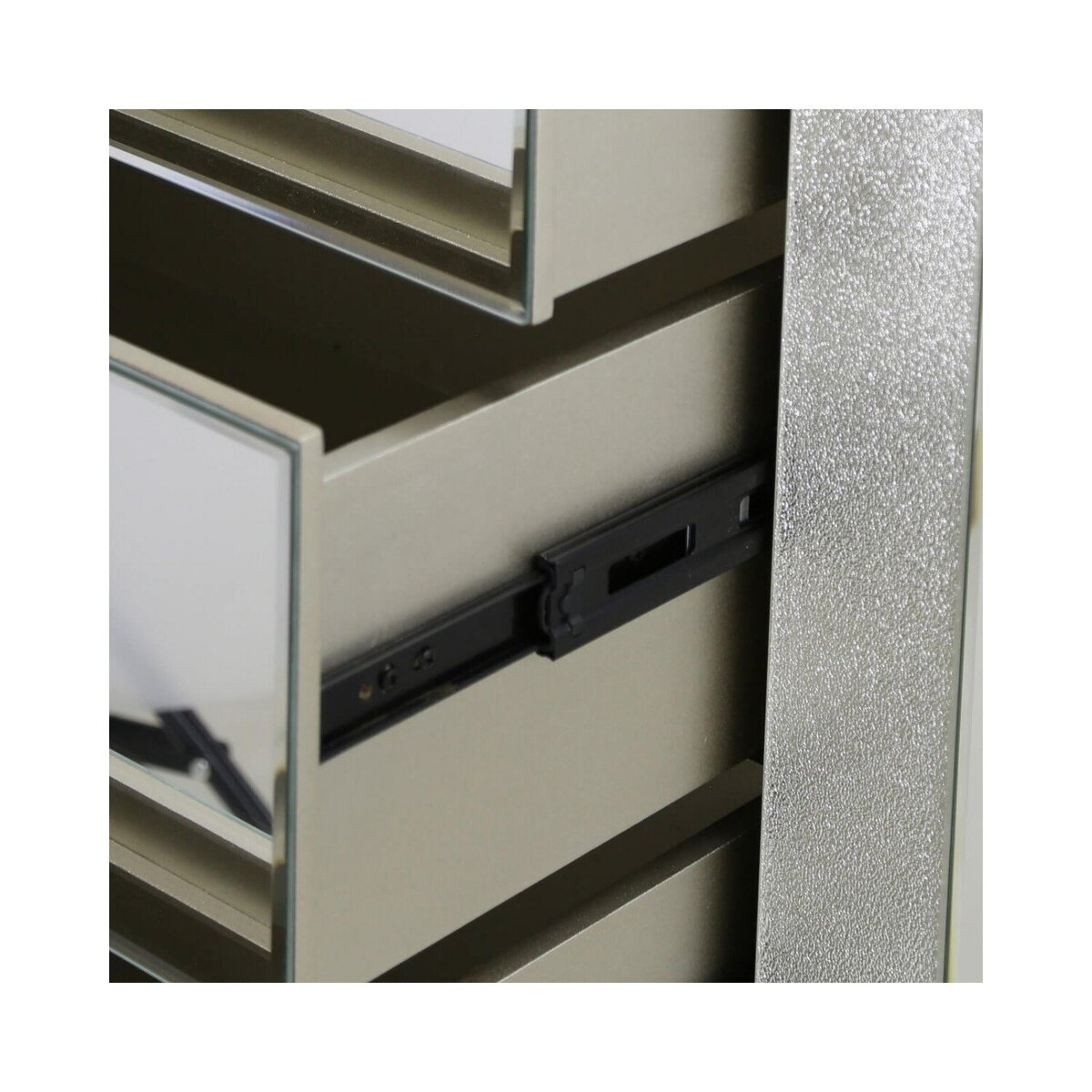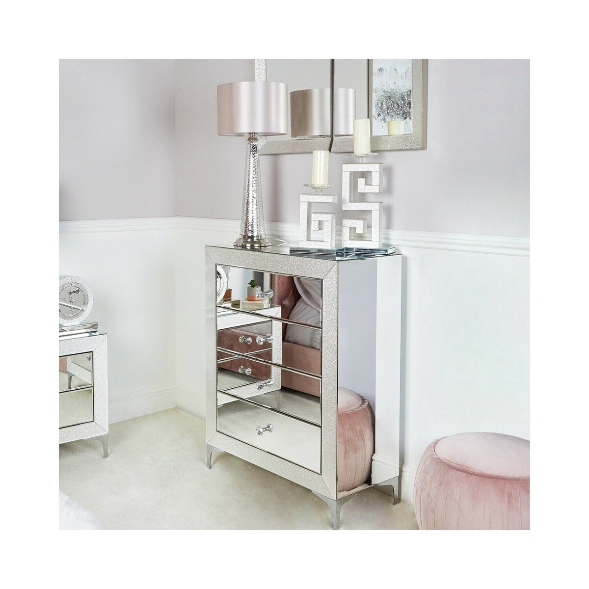 Ariana 4 drawer cabinet featuring mirrored panels throughout with a champagne sparkle surround, 4 generous drawers on metal runners with a sparkling crystal handle to finish.