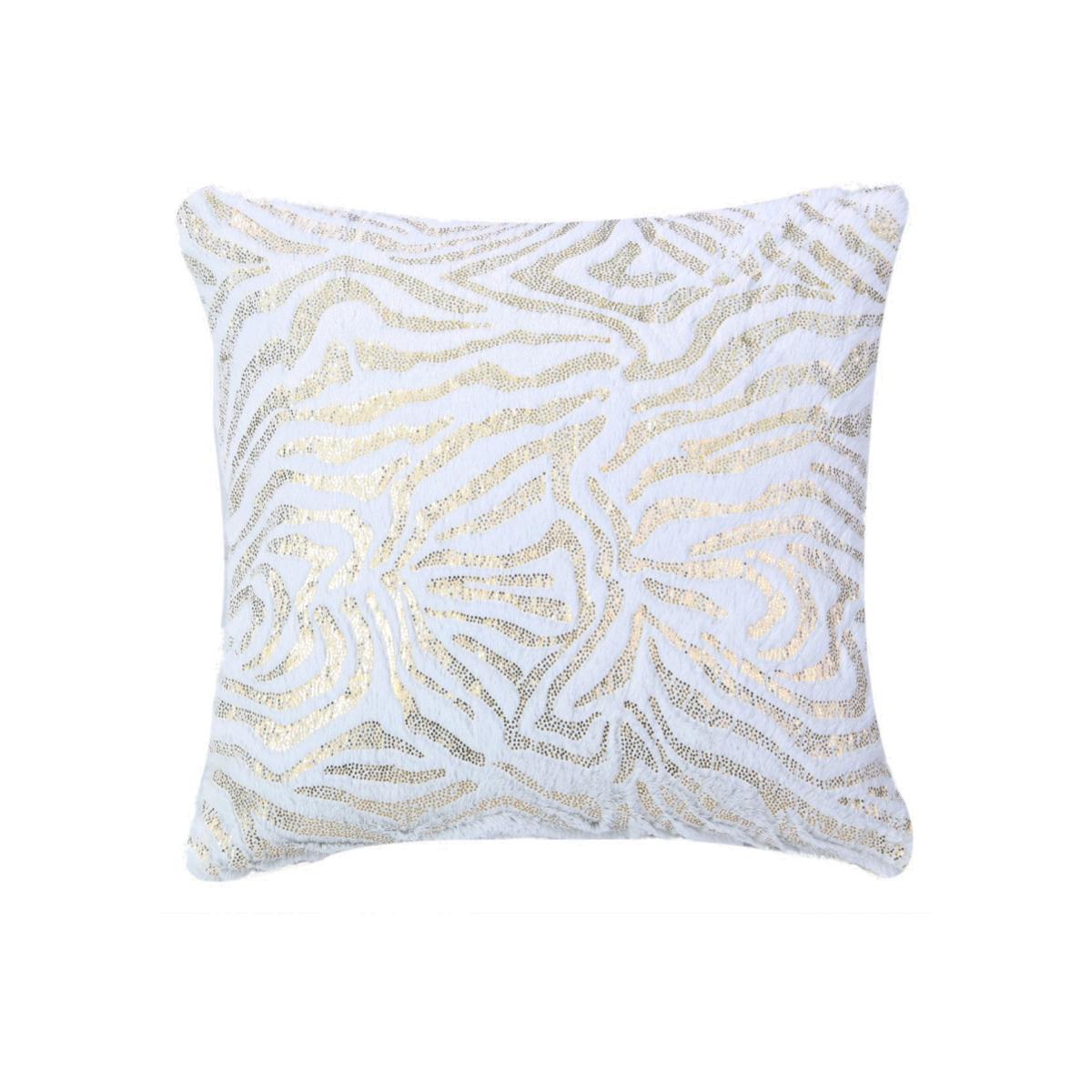 Faux fur white cushion featuring a gold metallic zebra pattern.