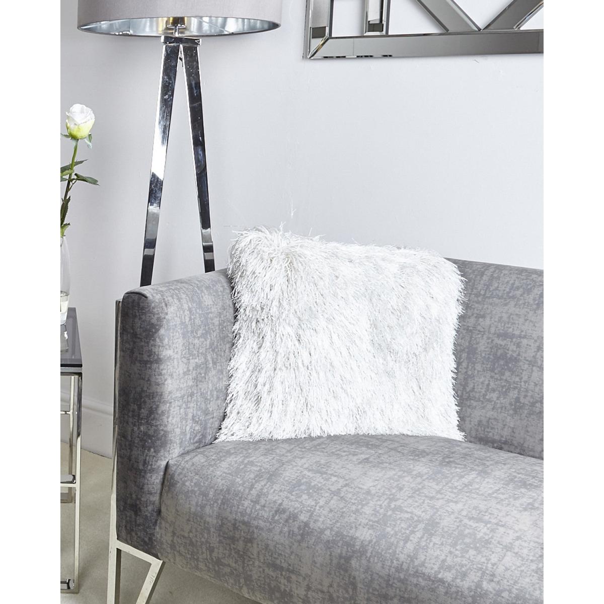 Filled Glittered White Shaggy Cushion 45x45cm. >.