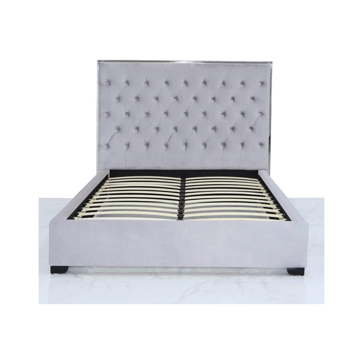 209cm Double size Monaco bed frame featuring a grey velvet style upholstery, deeply padded tufted buttoned headboard with a clear mirrored frame, sturdy wooden legs and a slatted base.