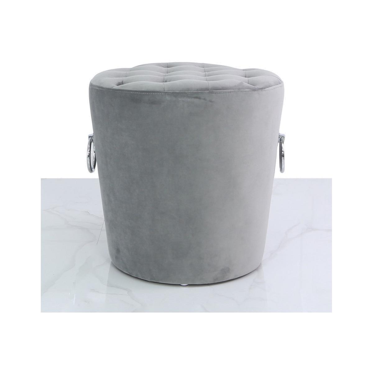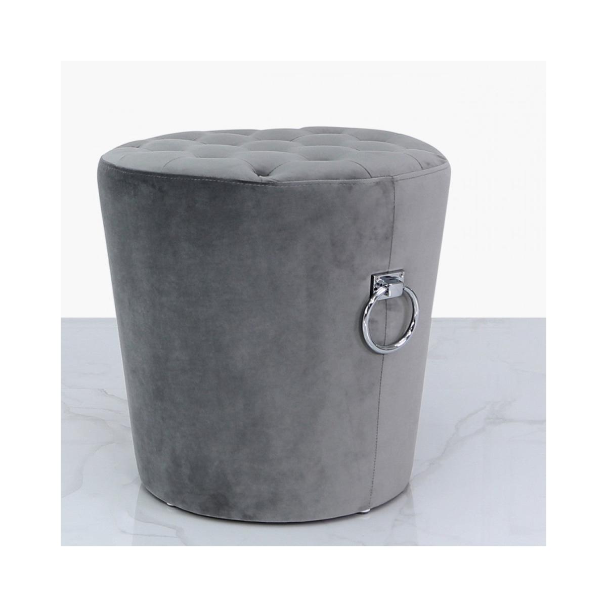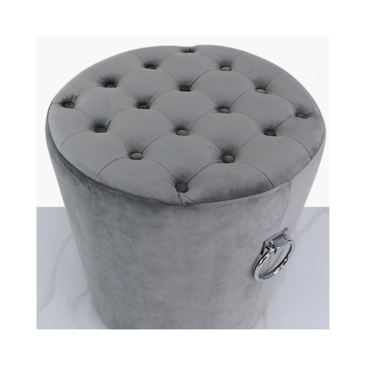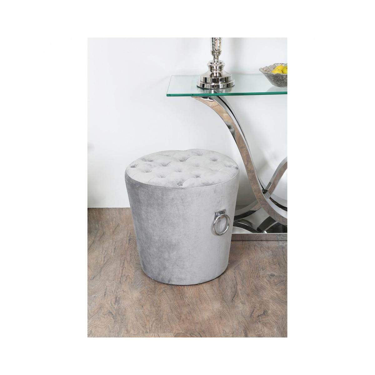 Eye-catching, stylish and incredibly luxurious the grey round stool would be perfect to use as a foot stool for relaxing or as a seat for a dressing table. Featuring a grey velvet fabric upholstery with tufted buttons and silver ring side handles.