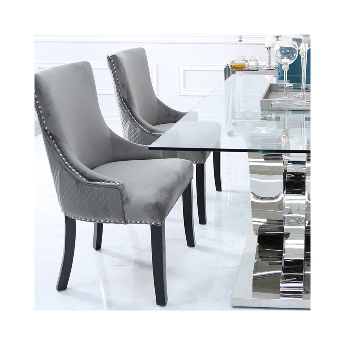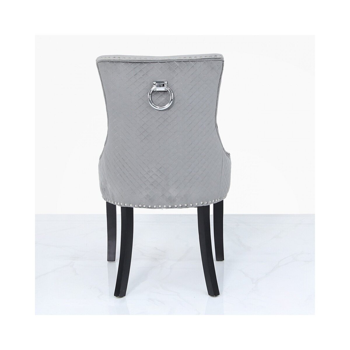 Upholstered in luxe velvet fabric with a scoop back, this dining chair has been made for luxury. Featuring grey velvet, silver studded trims with black wooden legs and a ring knocker back.