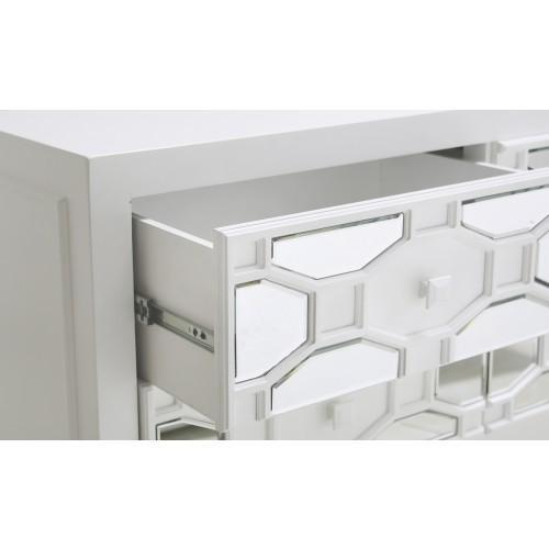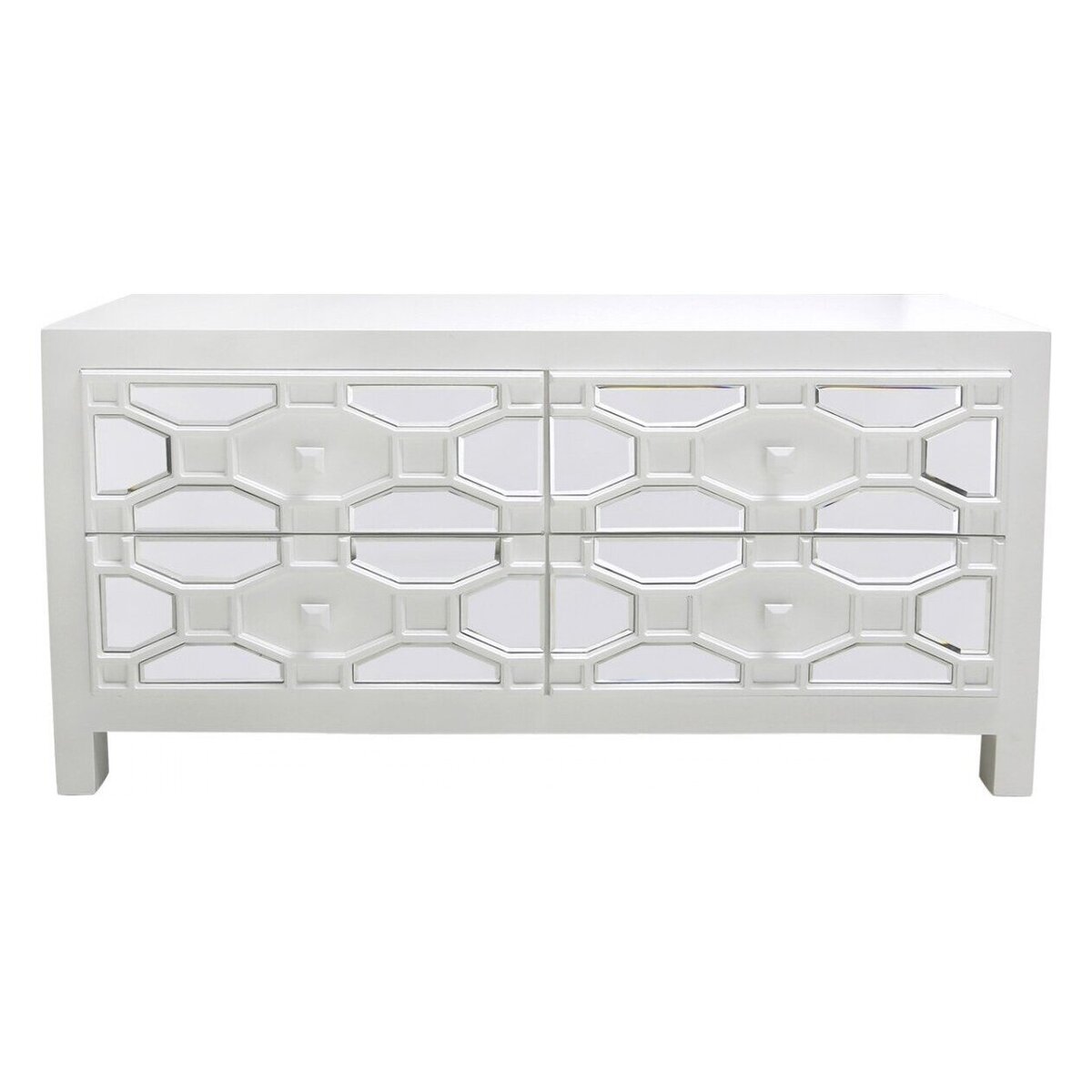 Hyatt White Geometric Wood Mirrored 4 Drawer TV Stand Entertainment Unit with Raised Geometric Design.