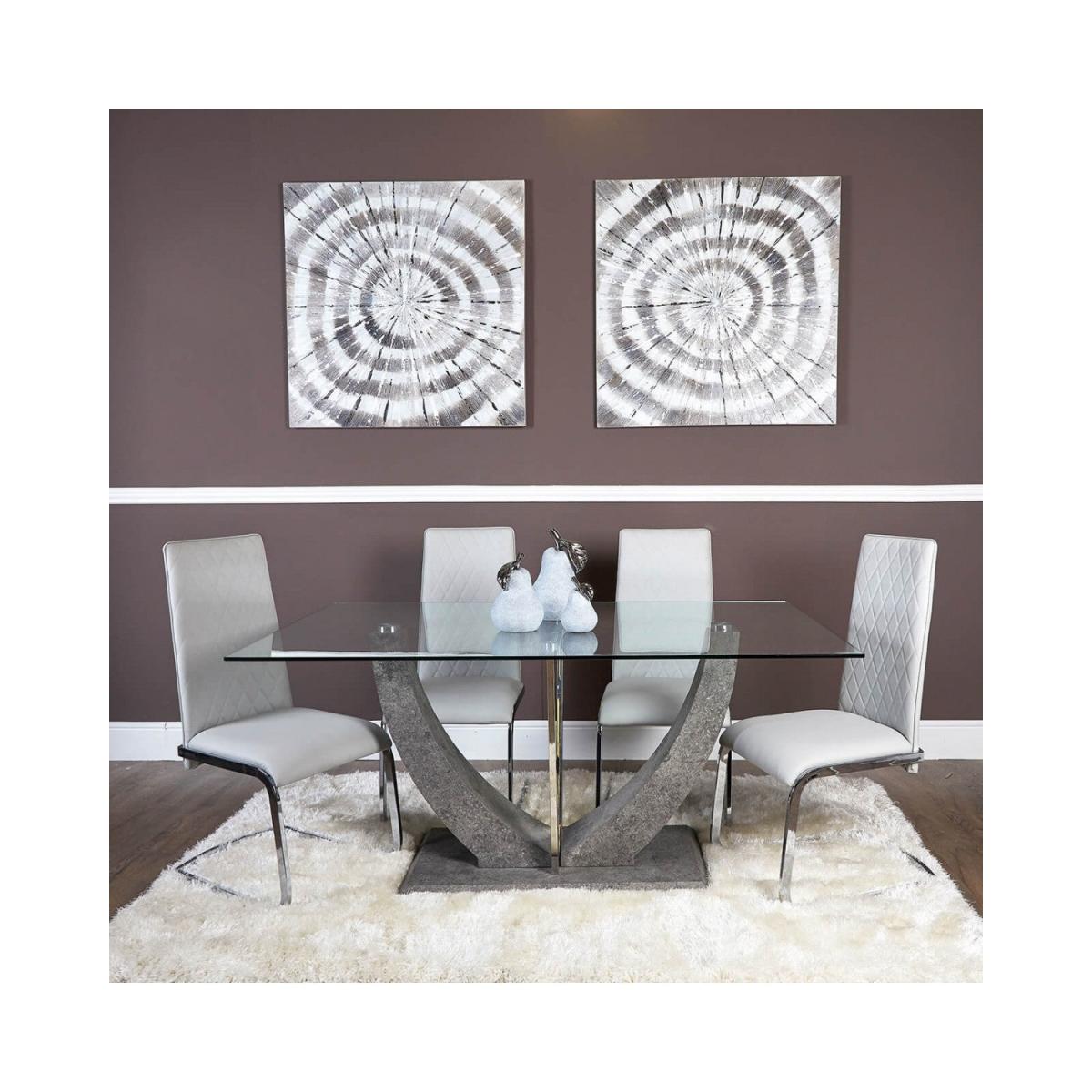 Exude style and sophistication in your dining room with this sleek glass dining table set. Featuring a V shaped metallic base with a toughened glass table top designed to withstand heavy usage. Accompanying the table are 4 stunning light grey faux leather chairs that feature a diamond stitched cross design and a stylish chrome frame.