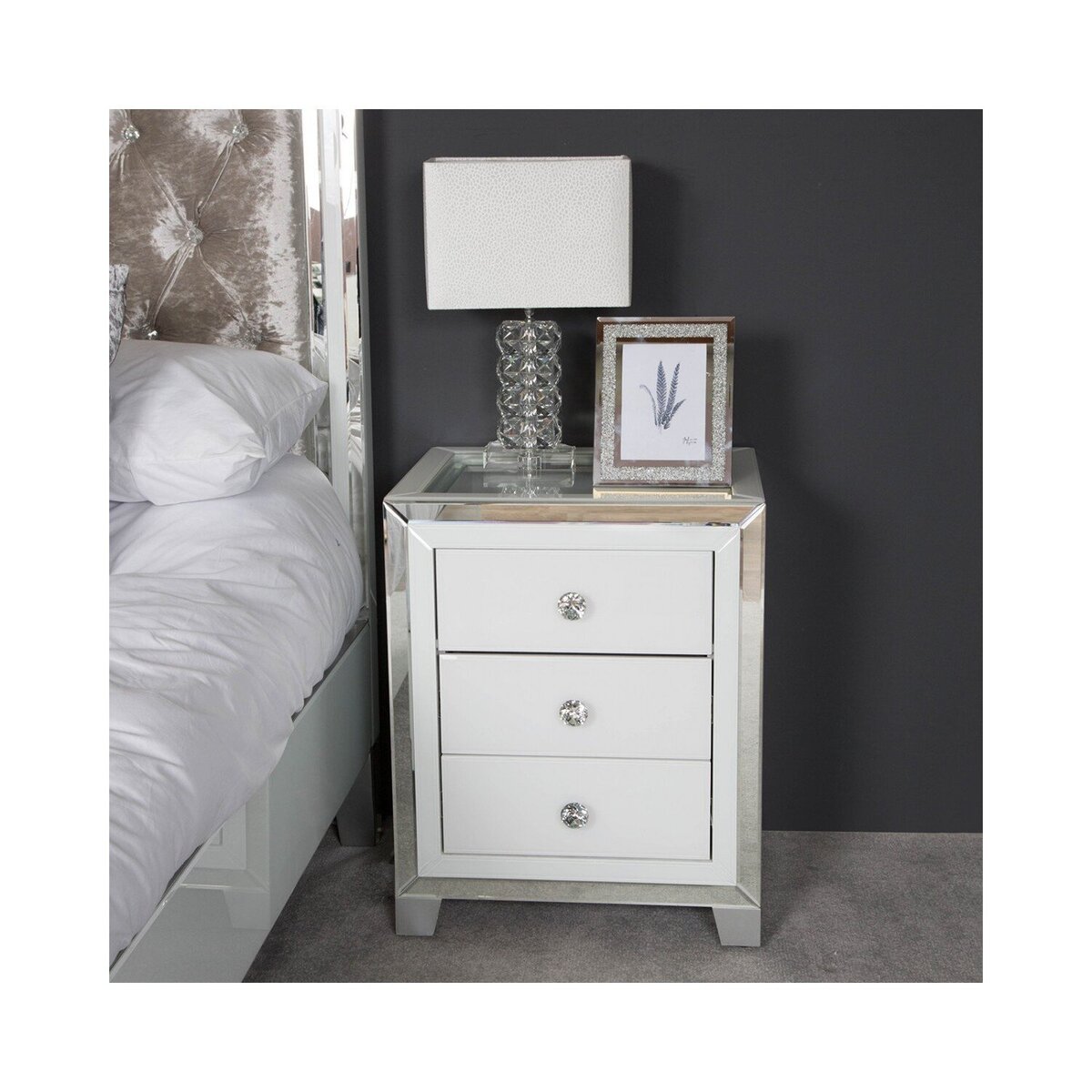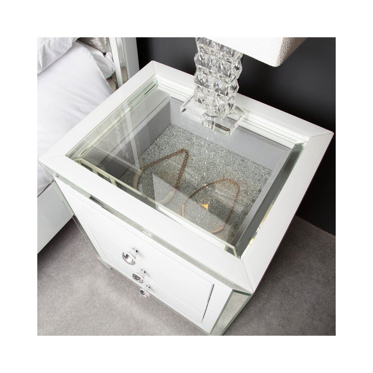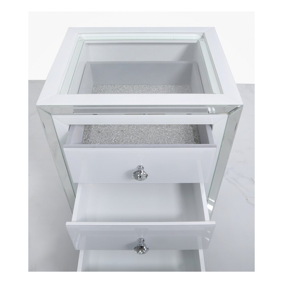 A newly re-styled version of the ever popular Madison range, this Madison White 3 drawer display bedside cabinet features a silver mirrored trim with white glass panels on the sides and front and a clear, see-through glass top showing upper drawer with a glitzy silver drawer base. This lovely small bedroom chest has two further storage drawers, all on runners and with sparkling crystal knob handles. A smooth, white finish will never go out of fashion or look dated and this updated version with transparent top panel adds a innovative, cool new idea to viewing your drawer contents without even having to open them.
