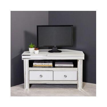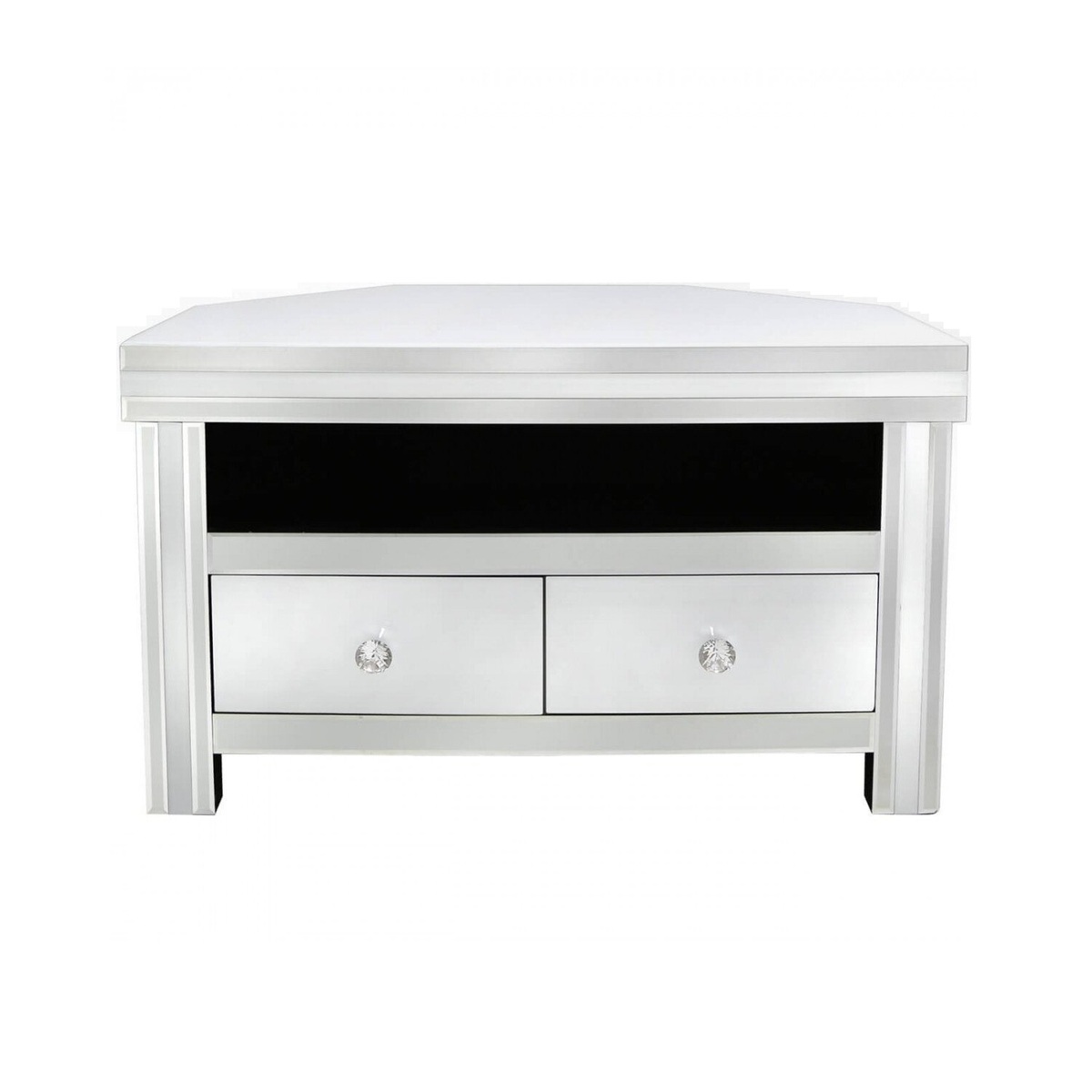 Stunning Madison smooth white glass panel corner 2 drawer TV cabinet with silver mirrored trim to front. This fabulous entertainment stand has one open shelf with rear cable access and two lower storage drawers complete with runners and sparkly crystal style knob handles. Designed to sit in the corner of the lounge or living room, you could also use this along a straight wall where space is at a premium. The Madison white is a hugely popular range and combines luxury, practicality and affordability. Team it with co-ordinating pieces including the coffee table, end or console table and sideboard to create a stunning contemporary interior.