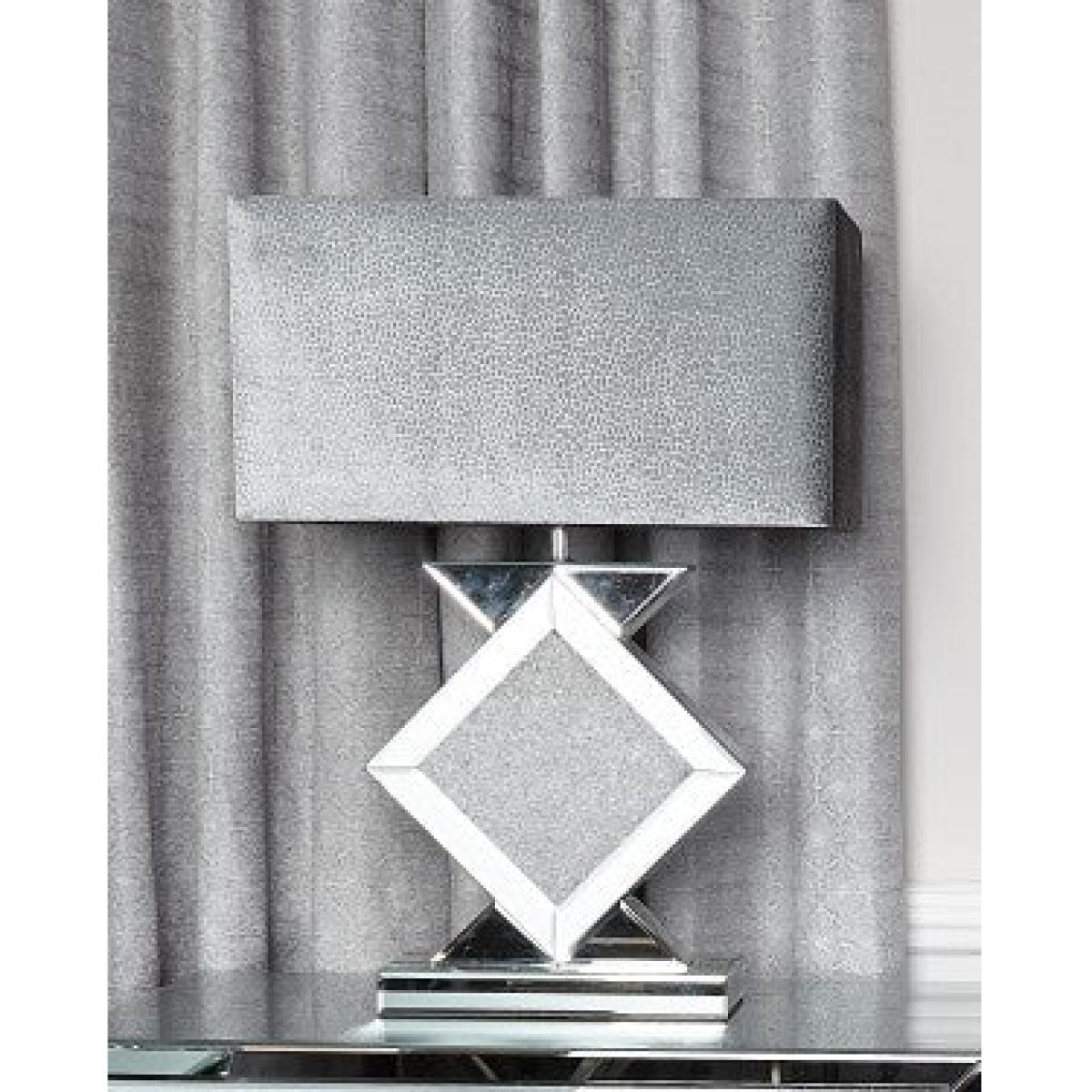 68. 5cm Makayla Smoked Mirror Diamond Shape Table Lamp including a 20-inch rectangular grey velvet snakeskin shade.