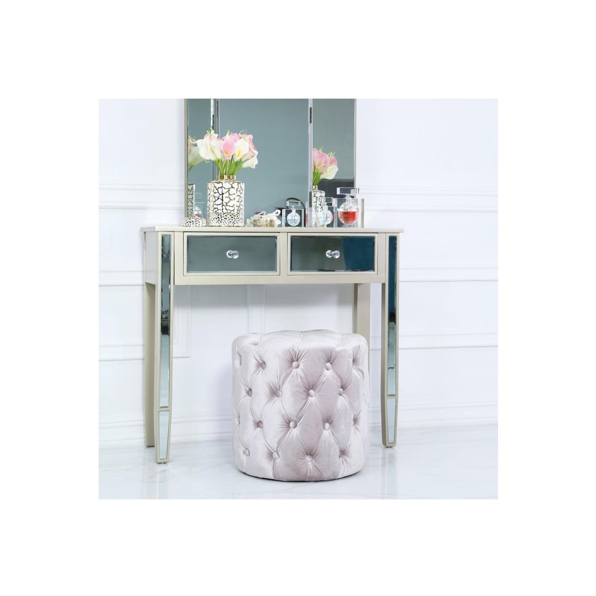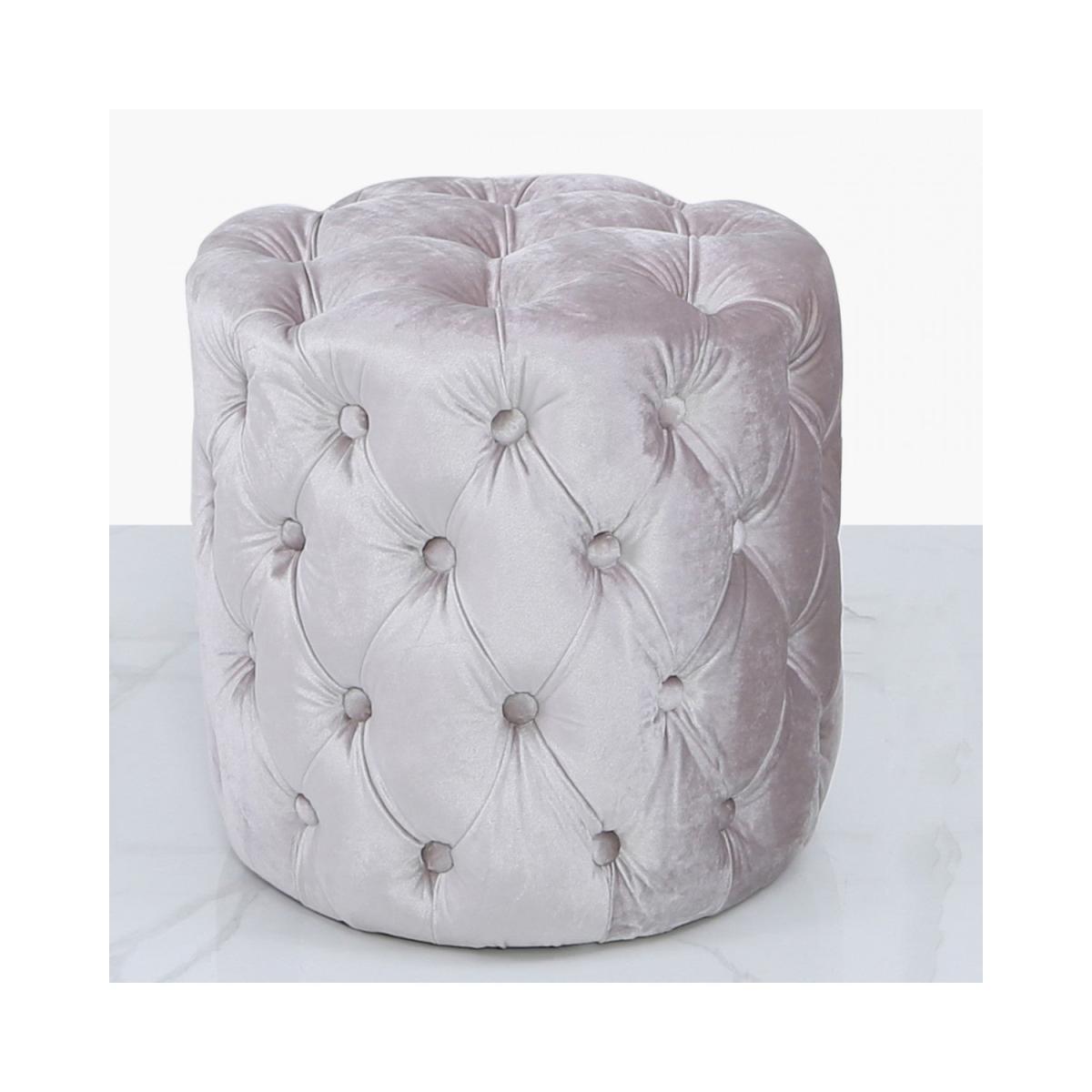 Nala soft pink tufted round stool featuring a deeply padded seat tufted with buttons finished in a pink velvet fabric.