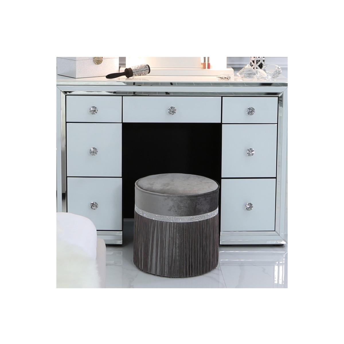 I really like this little stool because it brings a touch of glamour with the diamanté band, making it a versatile accent piece. It works well in contemporary or glamorous interiors, such as dressing rooms, bedrooms, or as an extra seat in a living room. Practical styling tip: use it as a side table paired with a statement lamp or place it in front of a full-length mirror for added sparkle. Its neutral grey shade ensures it can blend seamlessly into colour schemes, while the eye-catching band adds a sophisticated flair without overwhelming the space.