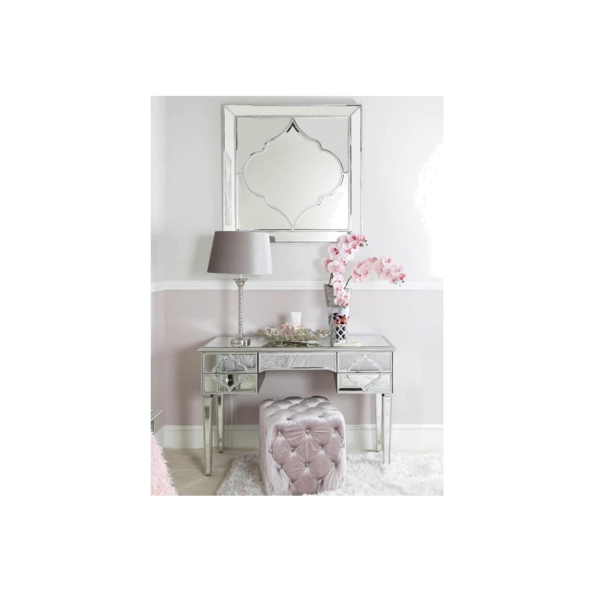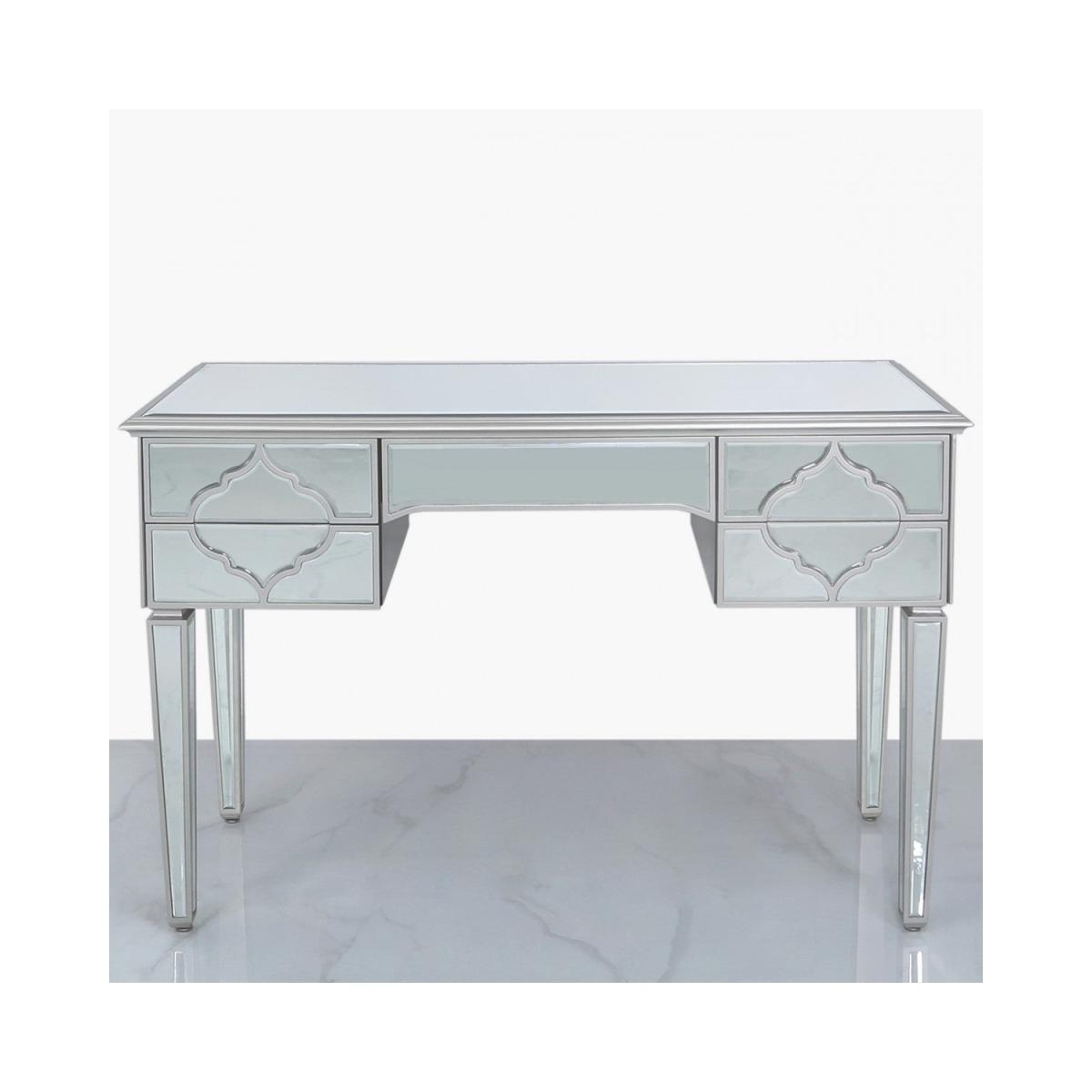 Lavish mirrored 5 drawer dressing or console table with beautiful silver trim and striking mirror drawer design. Part of the durable and sophisticated Sahara Silver range which is inspired by the ornate glitz of Morocco and brings a sumptuous feel with an ethnic retro flourish. This dressing table comes complete with drawer runners and silver trimmed mirrored front, sides and legs.
