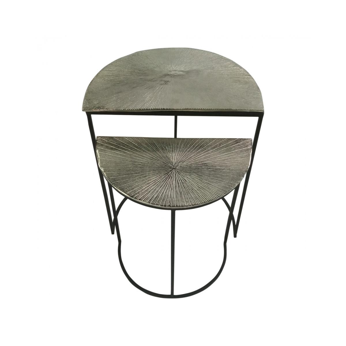 Value Harita set of 2 nesting tables featuring 2 small and large nickel half moon shaped table tops with a curved black frame.