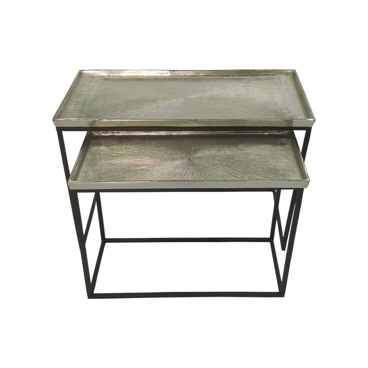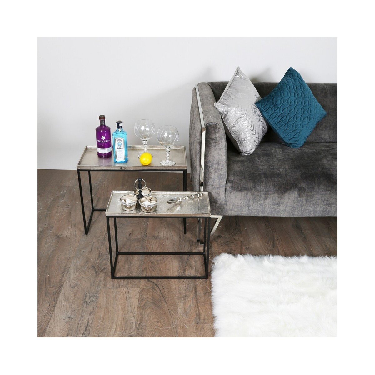 I love the sleek, contemporary look of these nestling tables - they’re versatile enough to fit into a variety of interiors, from modern minimalism to more industrial styles. The black frames paired with the nickel tops add a sophisticated touch that works well in both living rooms and bedrooms. They’re practical too, as the nesting function allows for flexible use - perfect for hosting or creating additional surface space when needed. For styling tips, try layering them with decorative trays, candles, or small plants to add personality, or use the smaller one as a side table or spot for drinks when entertaining. They work particularly well when paired with neutral colour schemes, providing a subtle contrast without overwhelming the space.