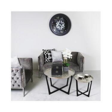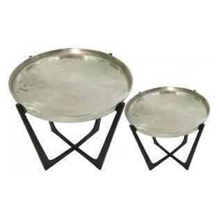 Value Rohan set of 2 nesting tables feature a turned up tray style nickel table top with a black cross base.
