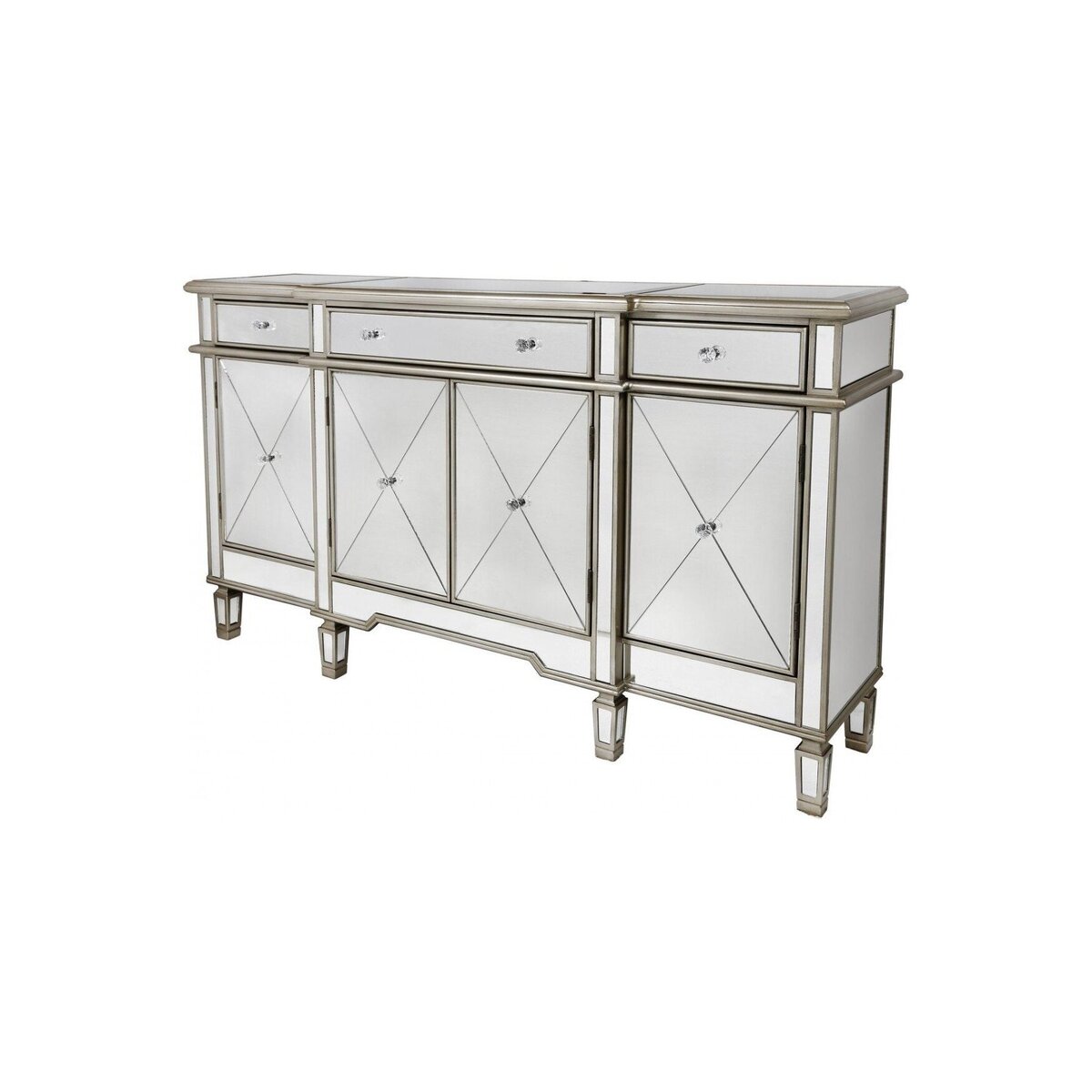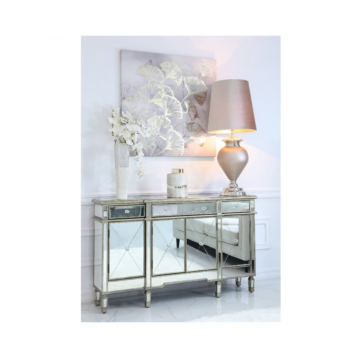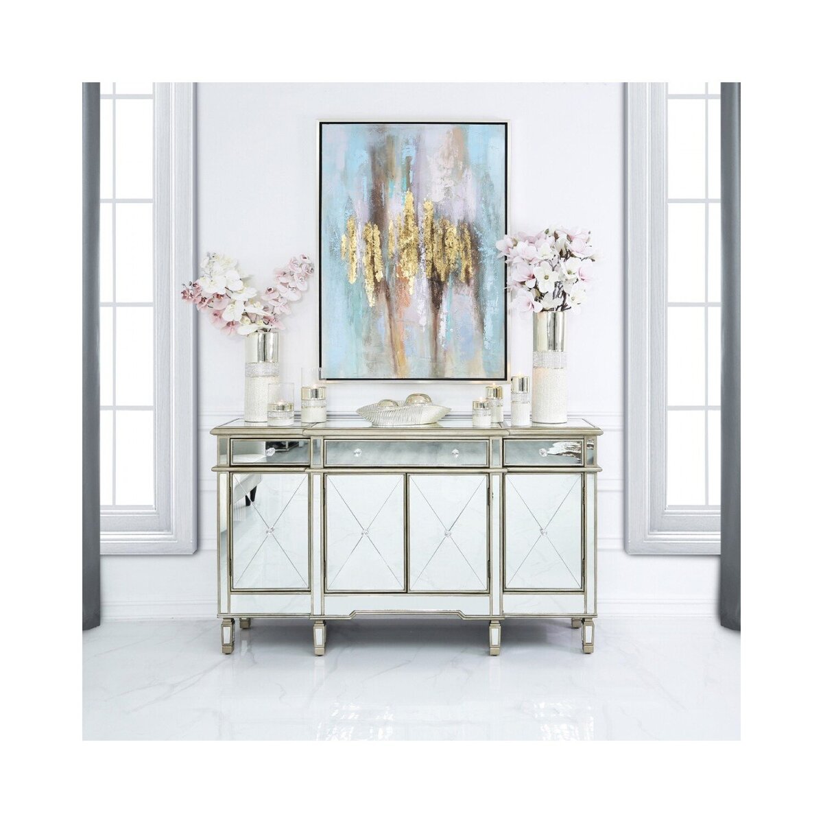 The Versailles Gold Sideboard is a fantastic cupboard that offers you a wonderful storage solution for keeping your space looking polished and clutter free. With the three drawers in two different sizes and two single door and centre double cupboard, this cabinet provides plenty of storage options. Each cupboard and drawer boasts a gorgeous dark interior that contrasts beautifully with the bright panelling and offers a unique, stylish take on classic mirrored furniture.