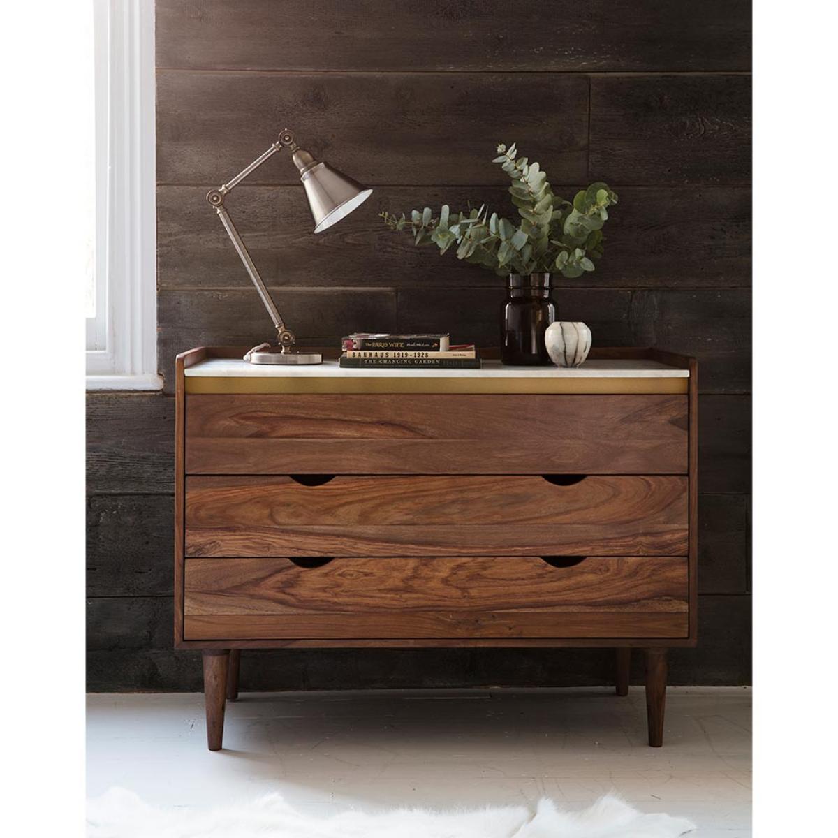 Our Deco white marble top chest of drawers will create an opulent ambience with its combination of rich, natural materials. Manufactured from distinctive rosewood with a contrasting white marble top and elegant brass inlay, this chest of drawers comes in a rich brown colour that will add character to your space. Our Deco marble top chest of drawers has clean lines and is designed with three spacious drawers - whether you need to refresh your living room or a bedroom, this chest of drawers is a great choice if you need some extra storage.