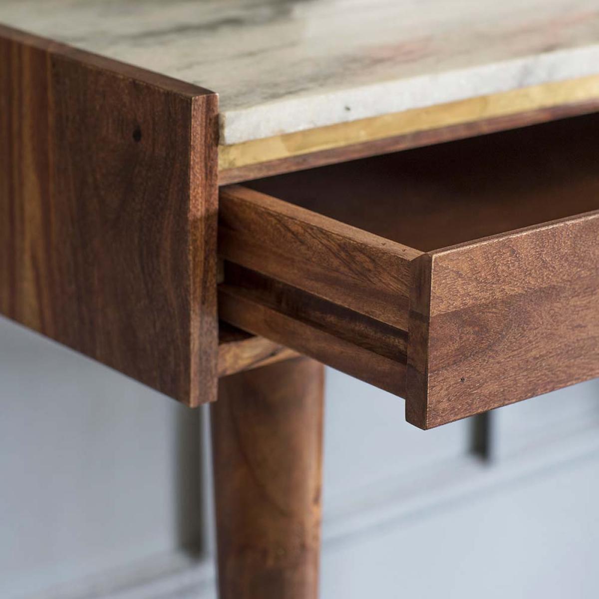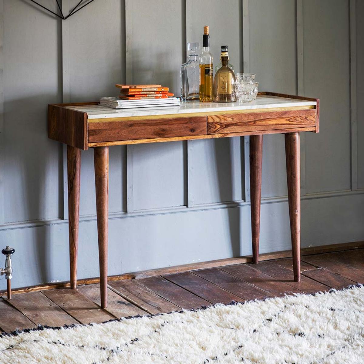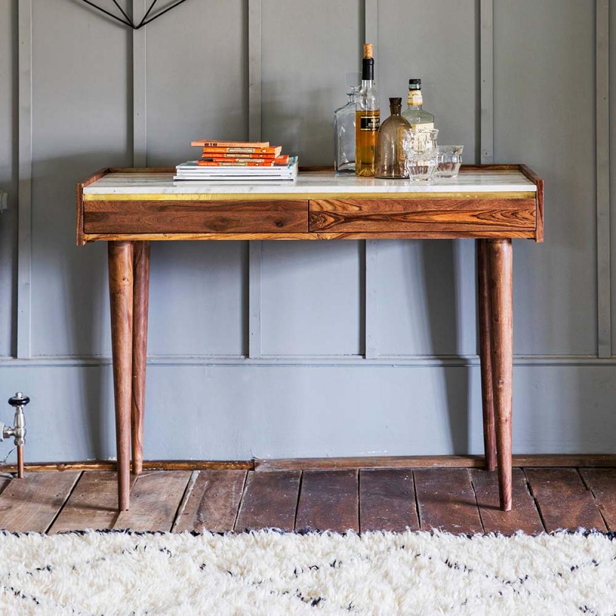 Whether you work at home or simply need somewhere to sit and sort out the household bills and paperwork, our Deco Marble Desk Console is perfect for catching up and concentrating. Manufactured from distinctive rosewood wood with a contrasting white marble top and elegant brass inlay, it would look equally striking in an office, bedroom, living area, dining room or open-plan space. It could also work as a quiet study area on a large landing and is handy for all family members. It also incorporates two drawers to keep letters, bills and filing neatly stored away yet within easy reach.