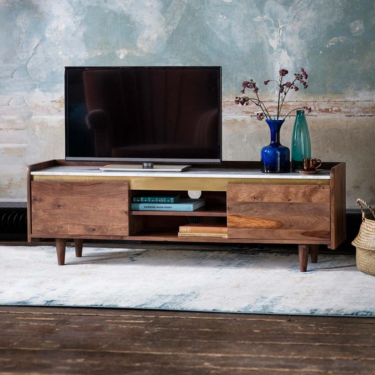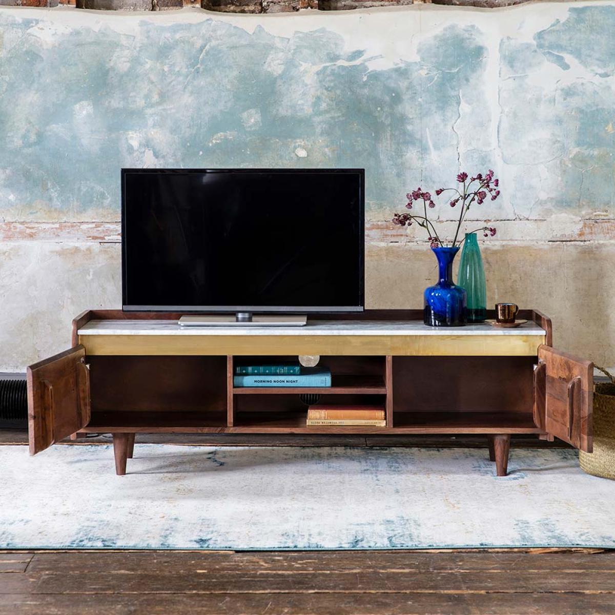 Large enough for the TV, DVD player, games consoles, music system, Sky box and more, our Deco Marble Media Cabinet has a Mid-Century Modern look with its unusual rosewood design complemented by a brass inlay and white marble top. A flexible piece of furniture, this beautiful cabinet will complement any style of interior and would blend easily with a variety of furnishings and fixtures.