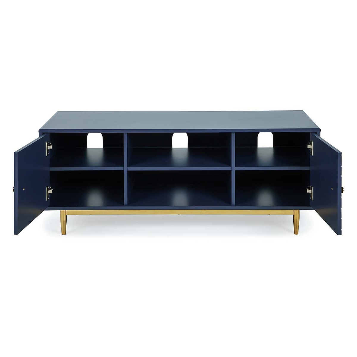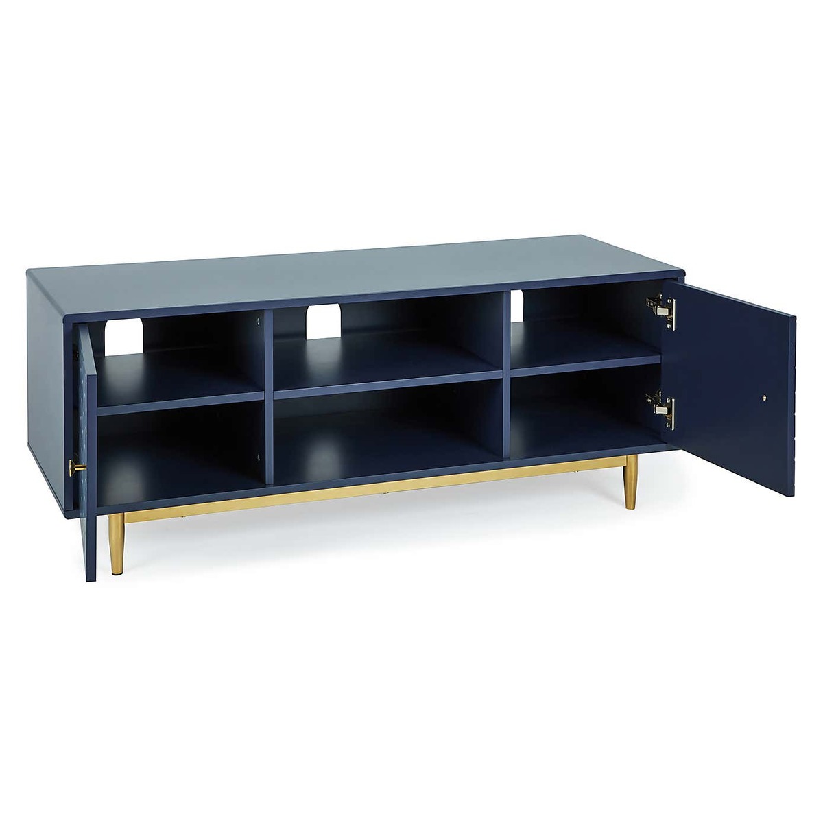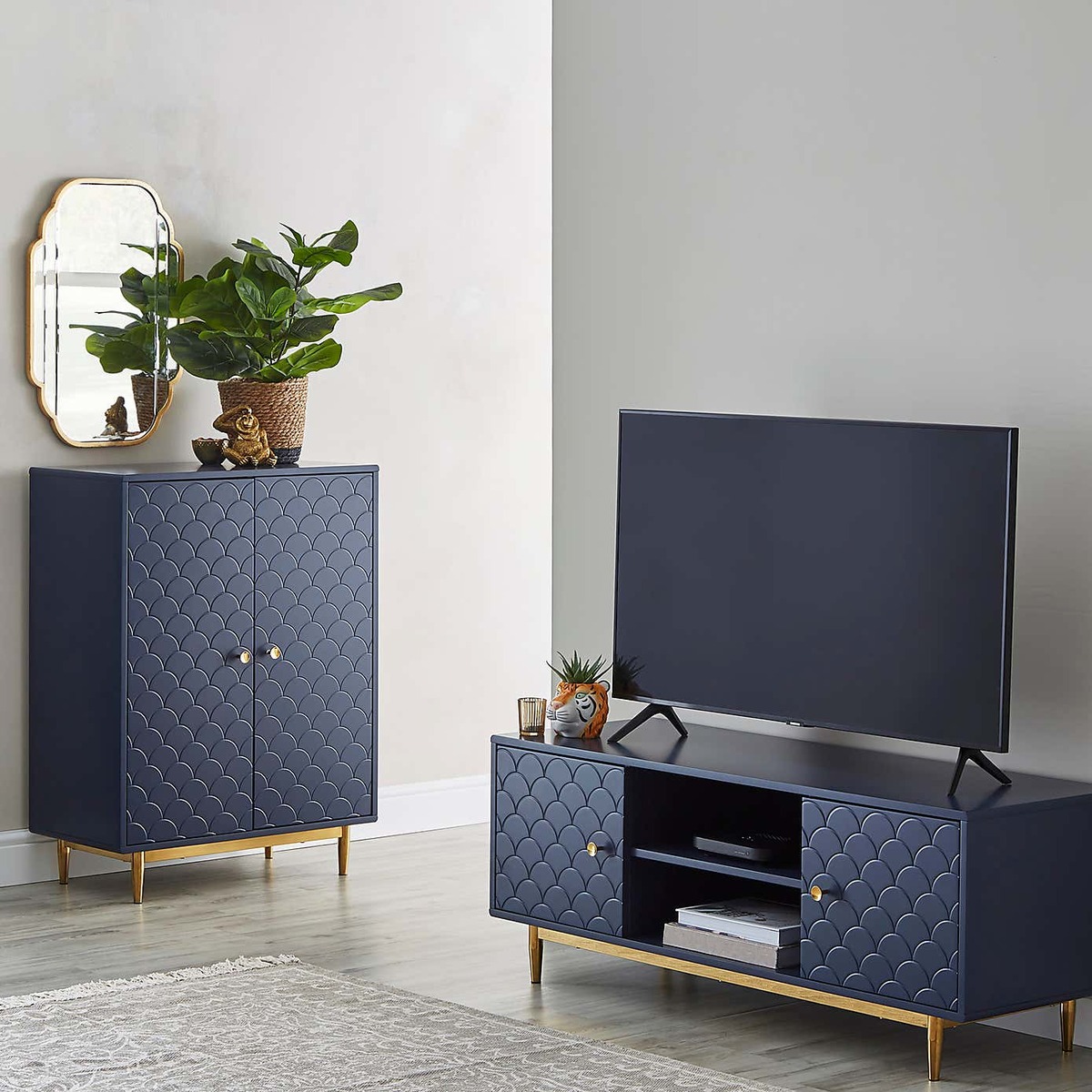 Dunelm Exclusive - Designed and Developed by Dunelm. With its glamorous art deco inspired design, the Deco range is perfect for brining a splash of colour to your home décor. This statement range is characterised by the delicate scalloped patterened fronts, navy blue painted finish and brass coloured accents. With space for up to a 55" television, The Deco TV Stand would make a stunning statement piece in any living room. This unti comes with two fixed open shelves with cable access, as well as two spacious cupboards, each with removable shelves, soft close hinges and additional cable access in the rear. Please use the wall attachments providing to prevent overturning. Care instructions: Avoid prolonged exposure to direct sunlight. Wipe up spills immediately with a damp cloth and avoid common hazards such as harsh solvents or abrasives. To view the assembly instructions.