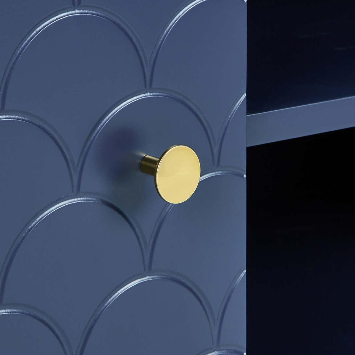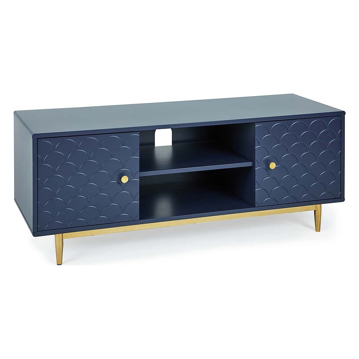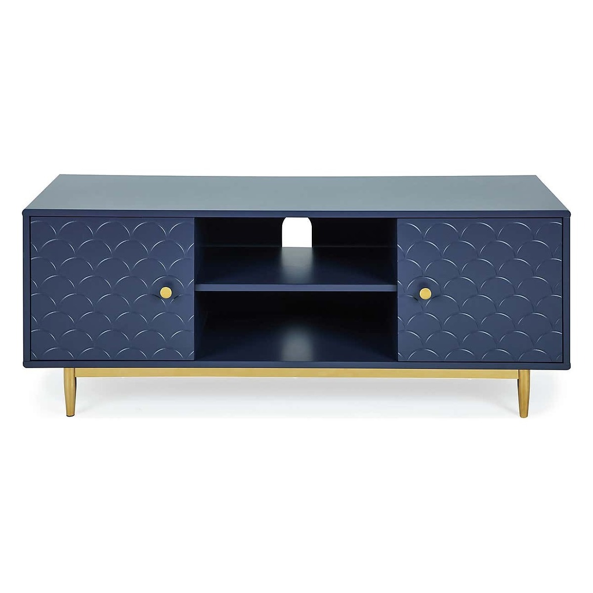 Dunelm Exclusive - Designed and Developed by Dunelm. With its glamorous art deco inspired design, the Deco range is perfect for brining a splash of colour to your home décor. This statement range is characterised by the delicate scalloped patterened fronts, navy blue painted finish and brass coloured accents. With space for up to a 55" television, The Deco TV Stand would make a stunning statement piece in any living room. This unti comes with two fixed open shelves with cable access, as well as two spacious cupboards, each with removable shelves, soft close hinges and additional cable access in the rear. Please use the wall attachments providing to prevent overturning. Care instructions: Avoid prolonged exposure to direct sunlight. Wipe up spills immediately with a damp cloth and avoid common hazards such as harsh solvents or abrasives. To view the assembly instructions.