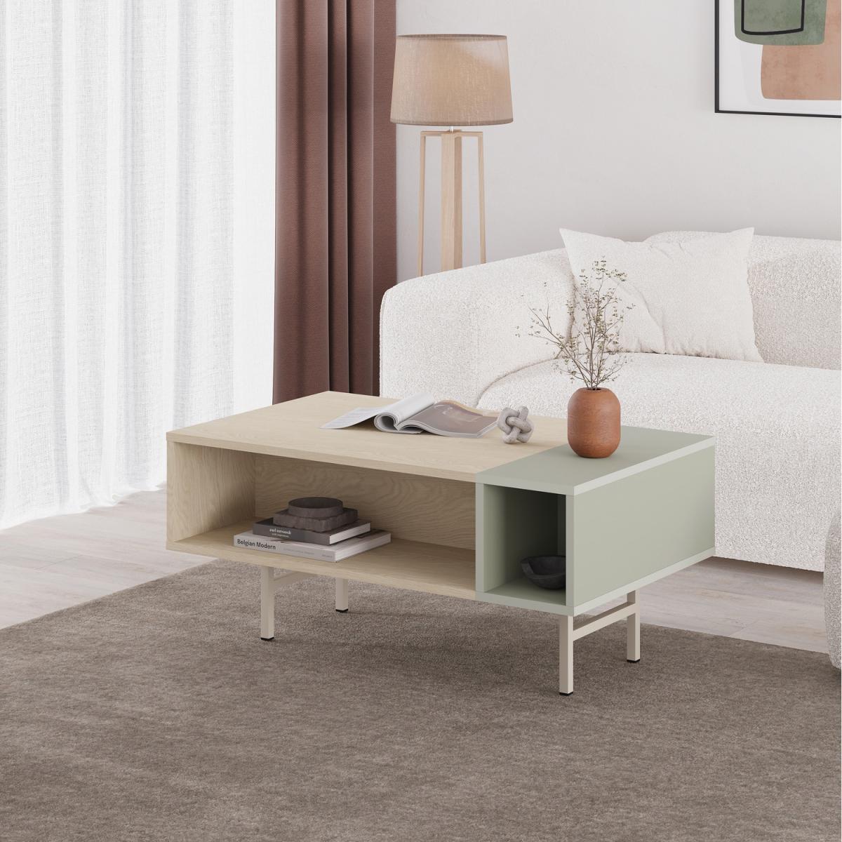 The Decortie Mona Modern Rectangle Coffee Table will make your living space stand out with its unique and modern style. This table features a spacious top for coffee trays and decor, along with four open storage compartments for neatly organising essentials. A flat metal tube structure underneath provides superior stability, supported by internal metal legs. The raised design ensures high clearance, making cleaning effortless and robot-vac friendly. Crafted from high-quality particleboard, the table features a contemporary Sonoma Oak and Ash Green two-tone finish.