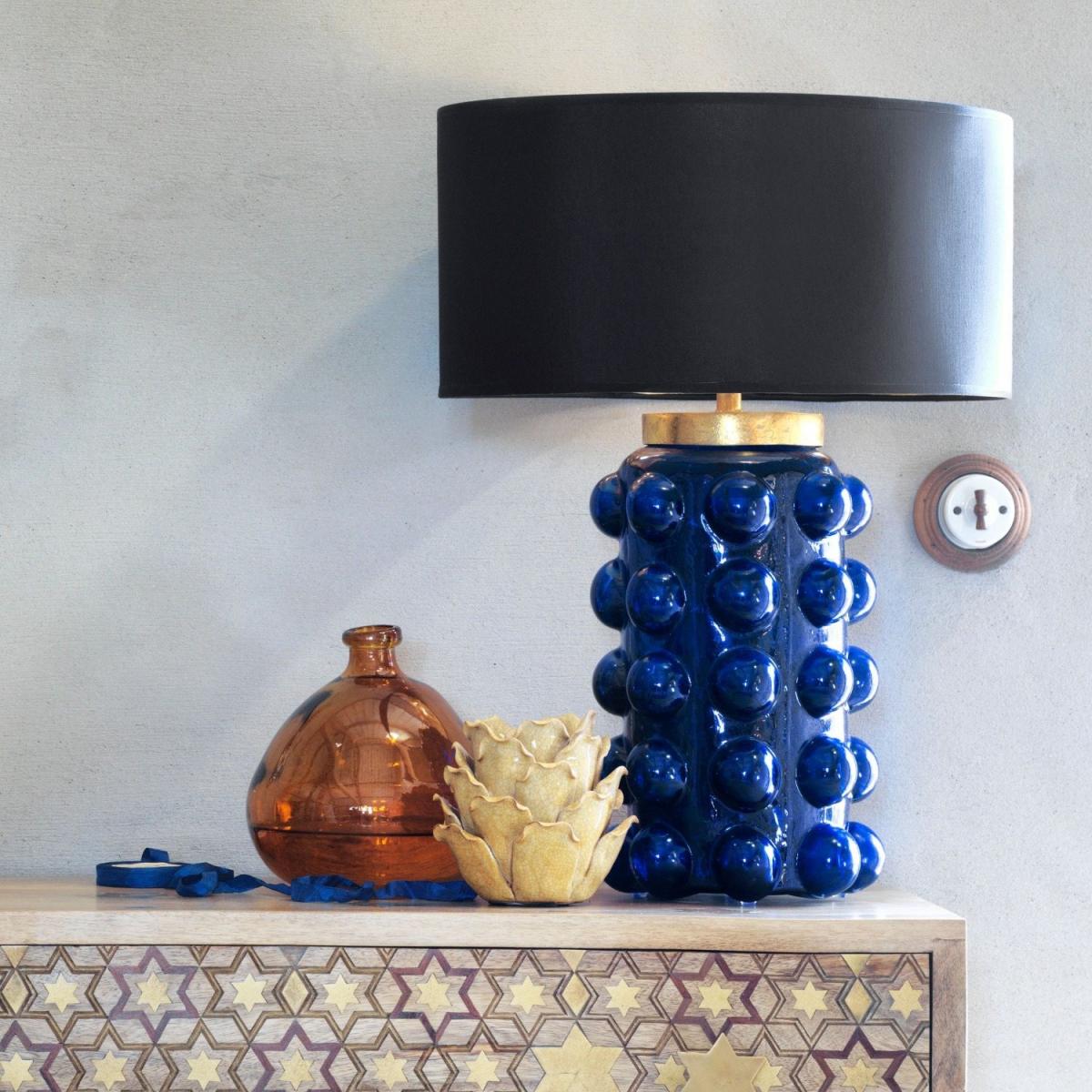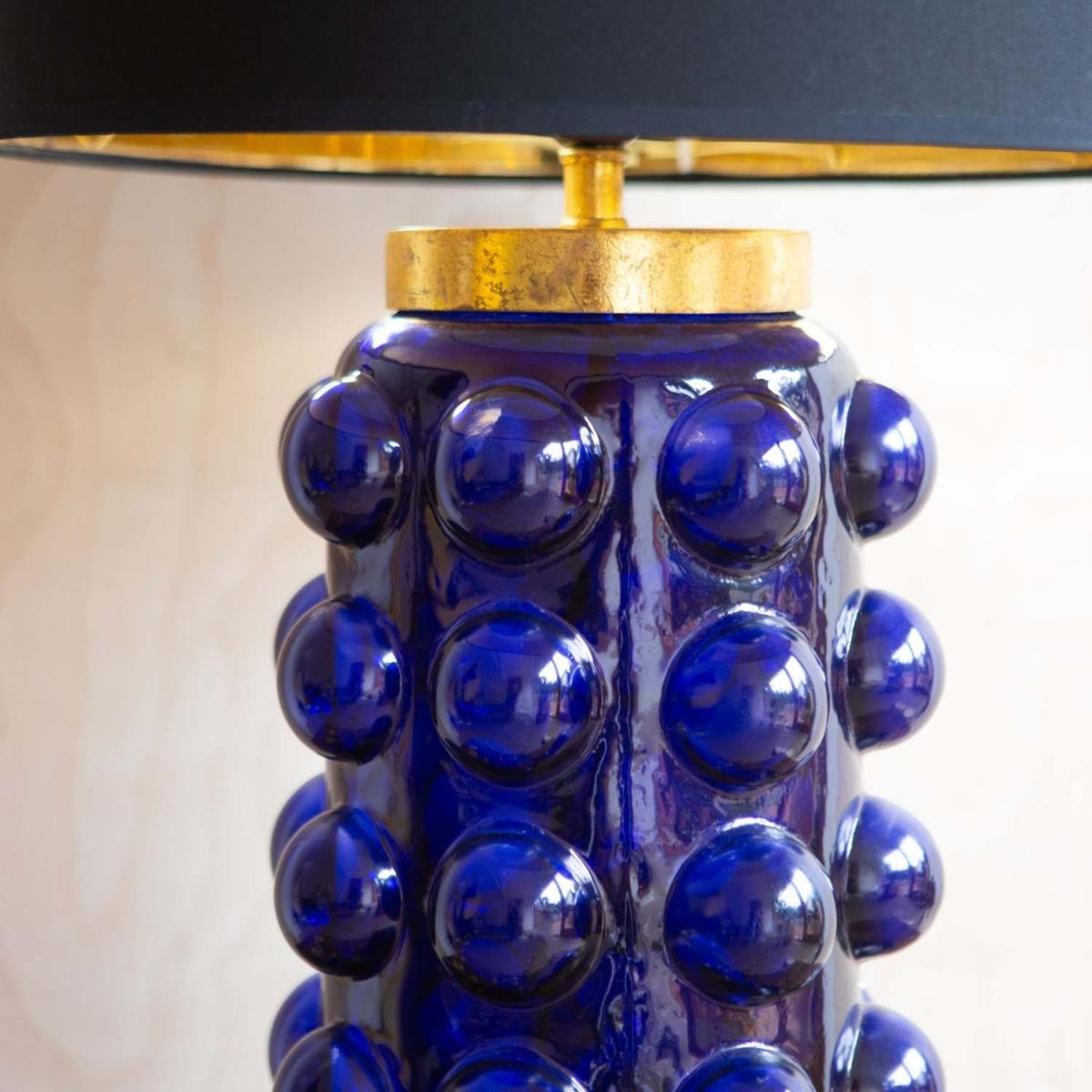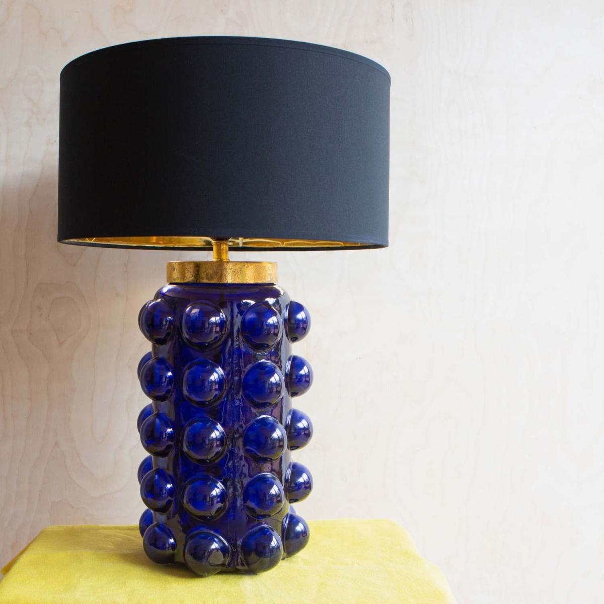 A deep blue lamp handcrafted from glass with a distinctive bobble exterior and contrasting metal top with an antiqued gold finish.