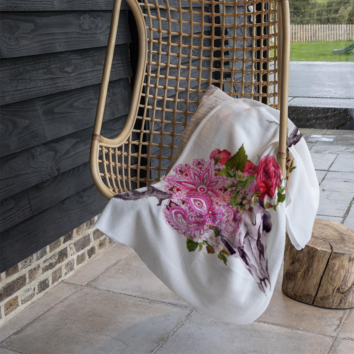I love this throw because it combines an earthy, rustic motif with a playful pop of pink, making it a versatile piece for various interiors. It’s particularly well-suited to boho or eclectic schemes where nature-inspired and quirky accents are celebrated, but it can also add a quirky touch to modern or pared-back spaces with its unexpected floral embellishments. Practical styling tips include draping it over the end of a bed for a statement look, layering it with other throws to add texture, or letting it act as a focal point on a plain sofa or armchair. The mix of natural elements with a touch of colour makes it a great way to introduce personality and create interest in a relaxed, cosy setting.