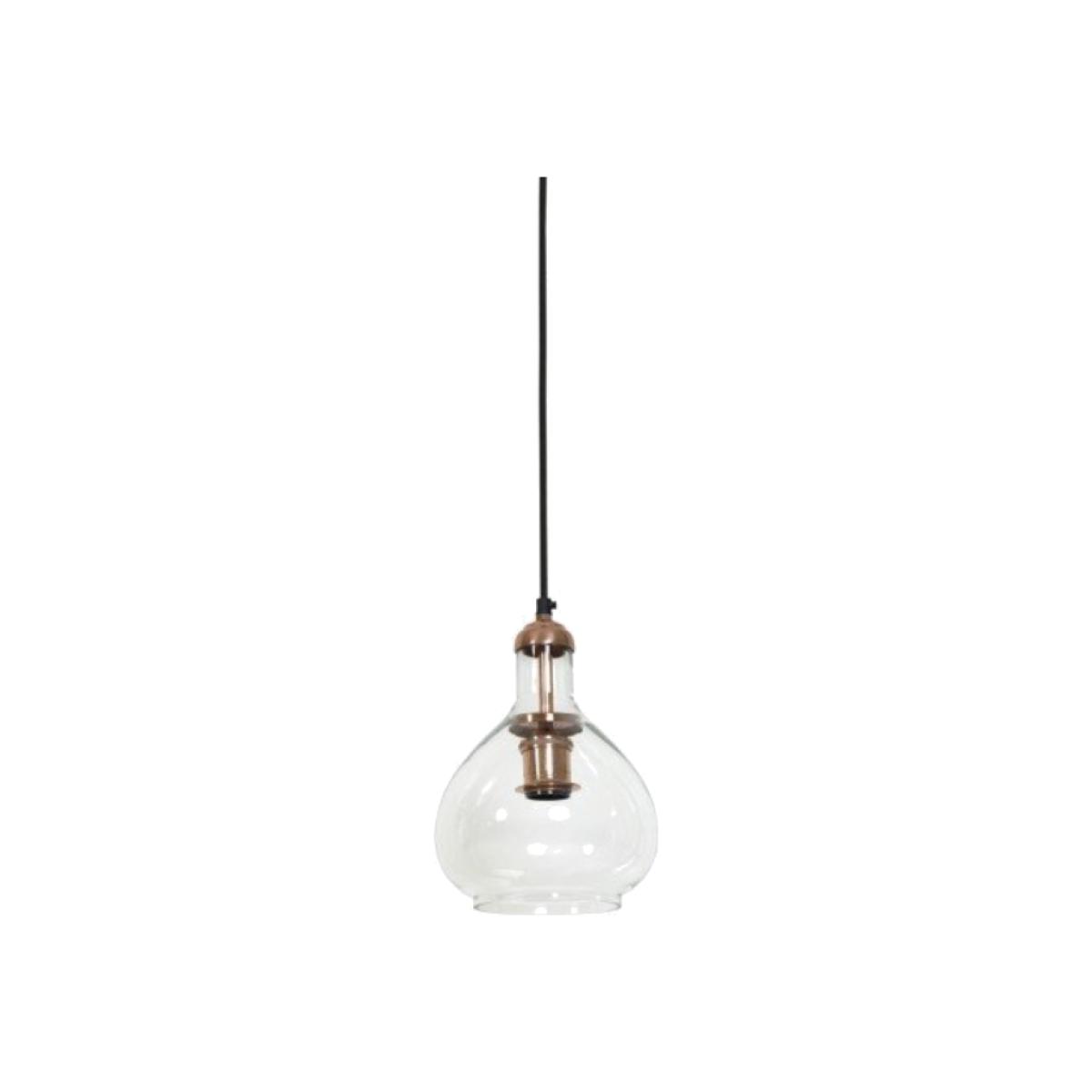 The Dela hanging light is a clear spherical glass shade with a long stem towards the copper top. A simple yet elegant design.