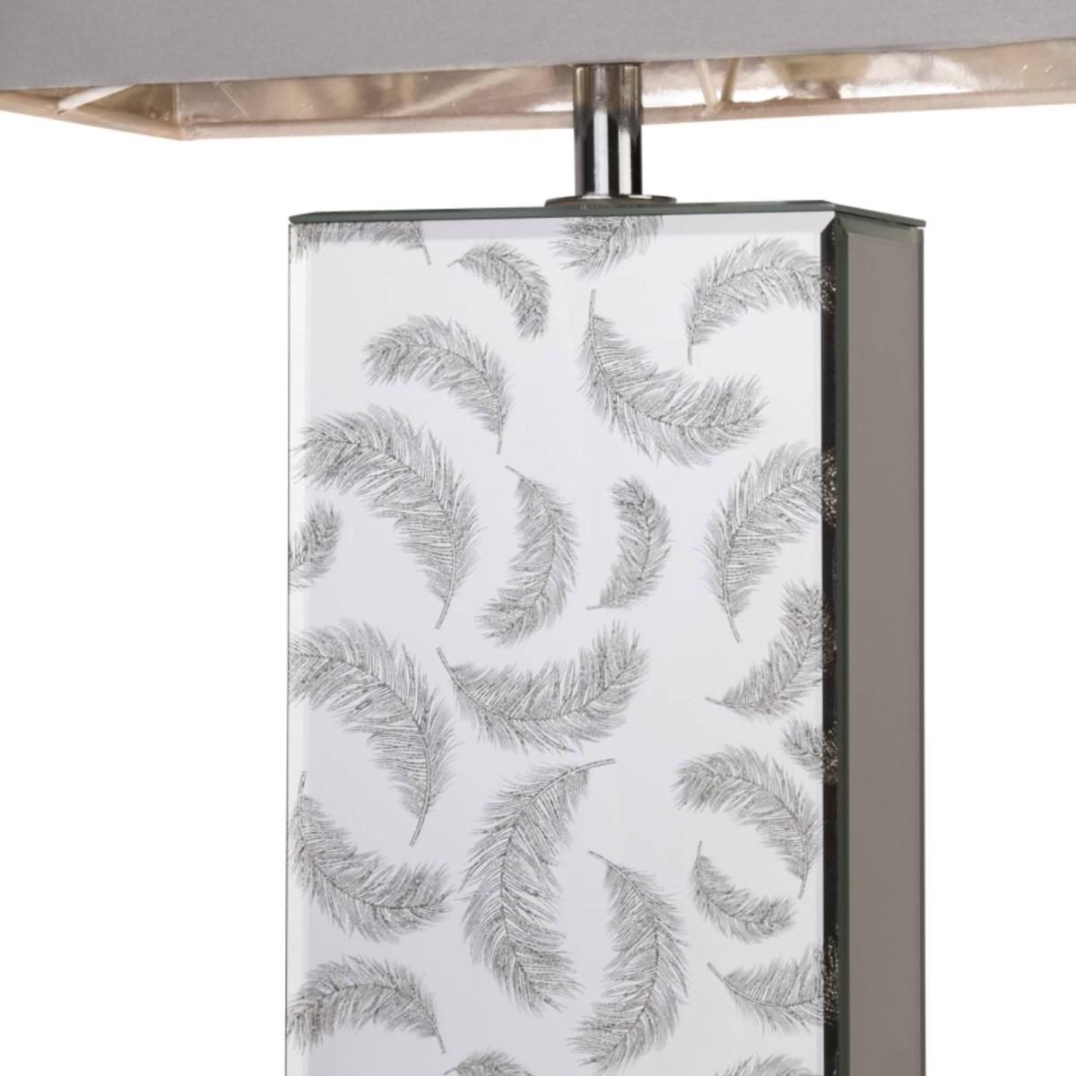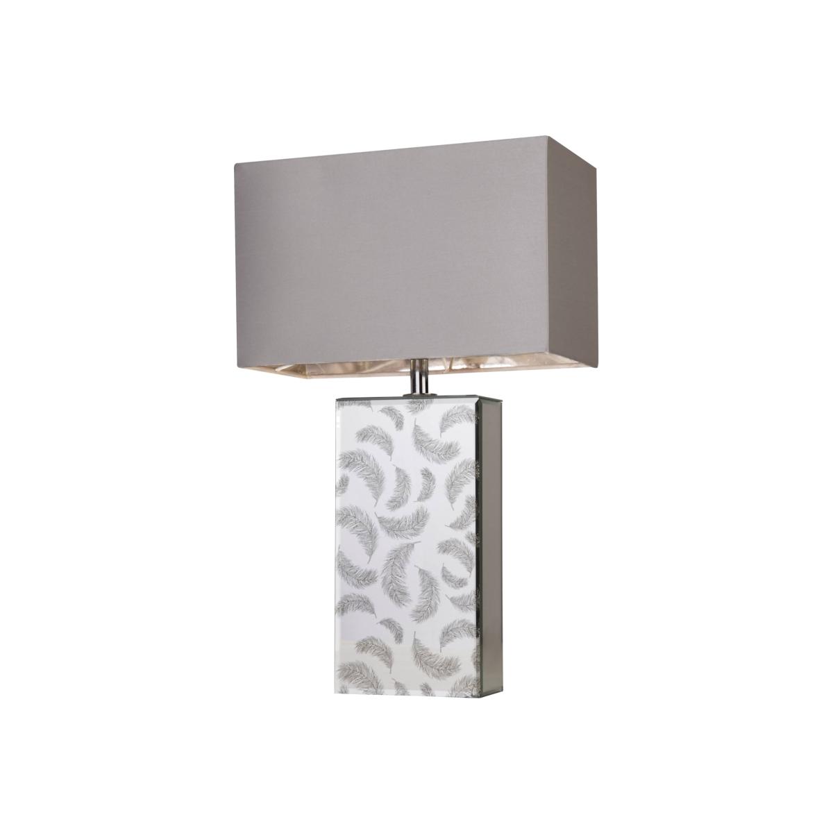 Modern polished chrome and mirrored table lamp boasting a grey shade. Update your interior with the beautifully modern Delancey table lamp, exclusive to Pagazzi. Featuring a stunning mirrored rectangle base with a glitter feather pattern, this polished chrome table lamp is complete with a grey and silver lined rectangular shade. Add some sparkle to your living room, hallway or bedroom with this stunning table lamp. Need Bulbs? Choose between a 14w or 7w LED light bulb to provide the brightness you desire.