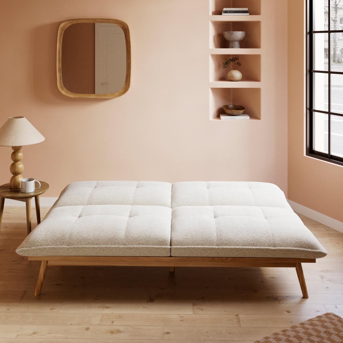 I love the Delaney Tonal Boucle Clic Clac sofa bed for its versatile and timeless appeal. Its neutral tones and textured boucle fabric make it easy to style across a variety of interiors, from Scandi-inspired minimalism to cosy contemporary spaces. It works particularly well in living rooms that double as guest spaces, thanks to its practical click-clack functionality. To keep it looking sleek, consider pairing with simple, monochrome cushions and a throw in natural fibres for a relaxed but polished look. For added versatility, style it with a statement rug and a few curated accessories-such as plants or art-around it to create a welcoming, lived-in feel.