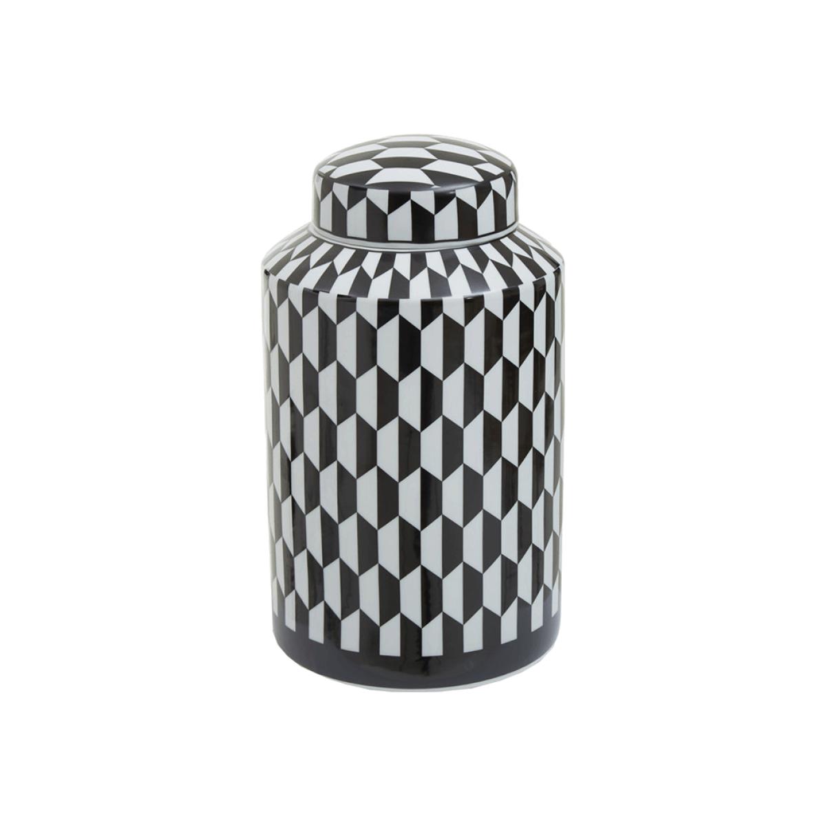 I love this piece because of its striking geometric pattern that adds visual interest without overwhelming a space. It works particularly well in contemporary or minimalist interiors, serving as a bold accent piece. When styling, consider placing it on a neutral sideboard or shelf to let the pattern stand out, or pair it with monochrome accessories for a cohesive look. For a more eclectic vibe, it can be combined with other graphic or textured objects. Keep in mind, the jar’s graphic design also makes it suitable as a functional decor item - it can double up as a stylish storage solution for small items or accessories.