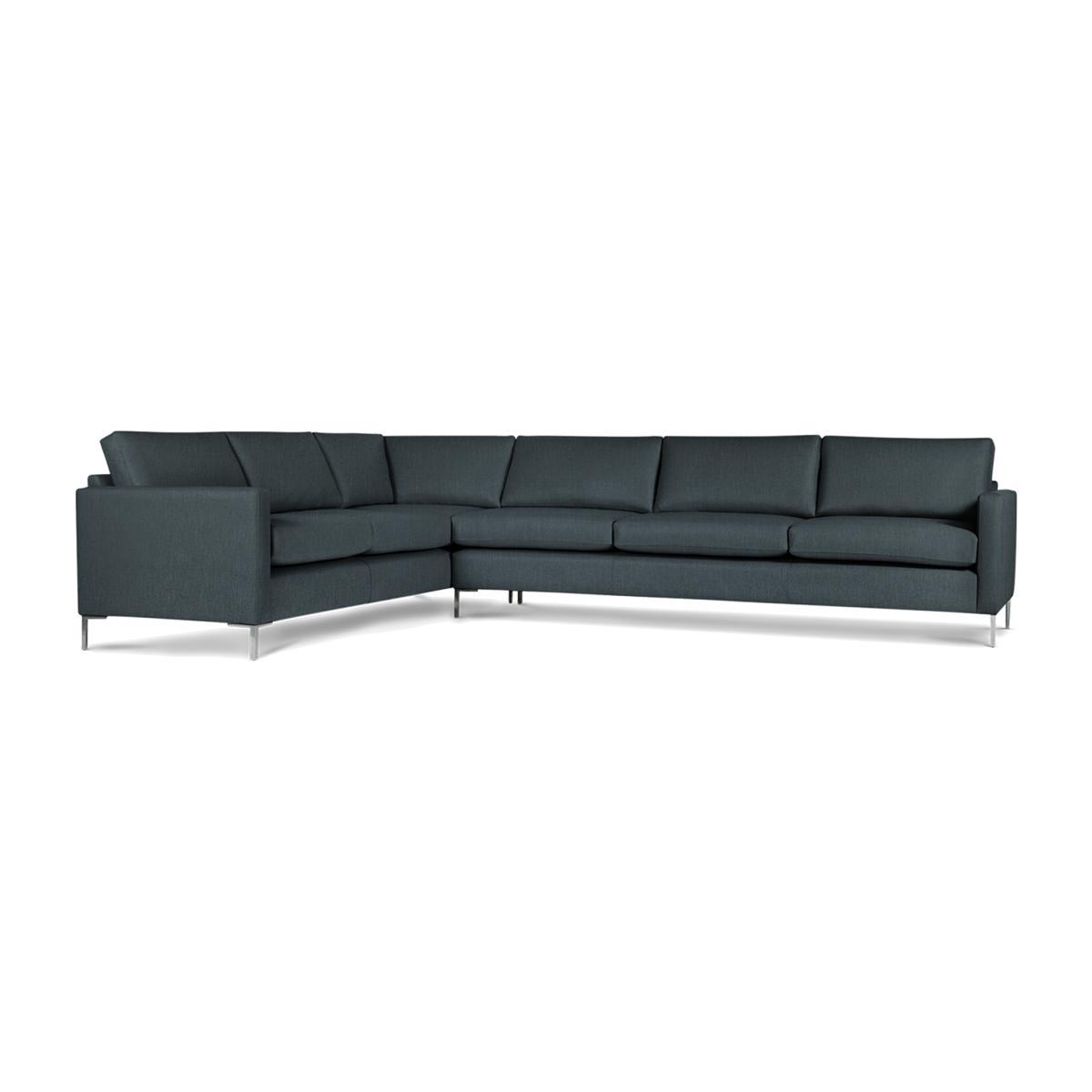I really like this corner unit because it offers a sleek, contemporary look with its denim blue hue, making it a versatile statement piece. It's perfect for modern or minimalist interiors, especially those with neutral tones or monochrome palettes, where the colour can pop without overwhelming the space. Practical styling tips include pairing it with textured cushions or throws in muted shades to add warmth, or metallic accents for a touch of sophistication. The shape and colour of this sofa make it ideal for open-plan living areas, providing ample seating while maintaining a clean, uncluttered aesthetic.