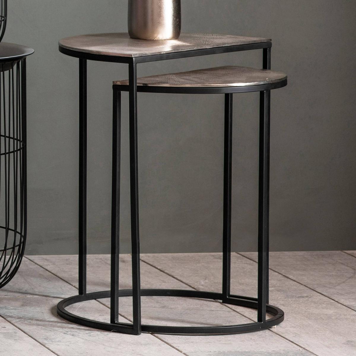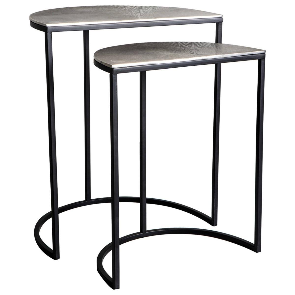 Industrially inspired nest of tables boasting a metal finish. Style your home with the contemporary Delfin Set of 2 tables from Gallery Direct. Boasting black metal framework, these tables can nest into a half moon when desired. A hammered silver metal top completes the look. Feature these tables in modern rooms for a fashionable space saving solution.