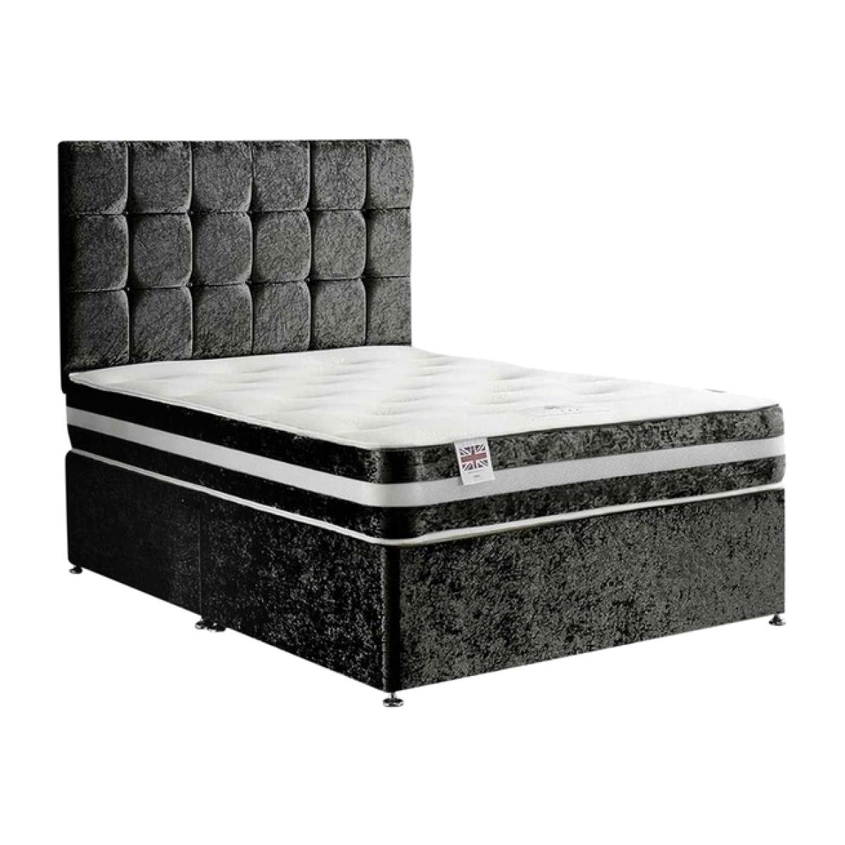 A contemporary style for any bedroom setting. This affordable yet quality divan bed comes with a 26 inch headboard, base and a memory spring mattress. This bed is available in 6 sizes and various fabrics and colours. There are storage options of having 2 drawers. The mattress is a 13.5 Open Coil Bonnell spring with a layer of responsive memory foam, hand tufted as it secures the classic mattress fillings and enhances the performance and life span. A medium to firm mattress with a depth of 10 inches this amazingly priced bed set represents great value for money.